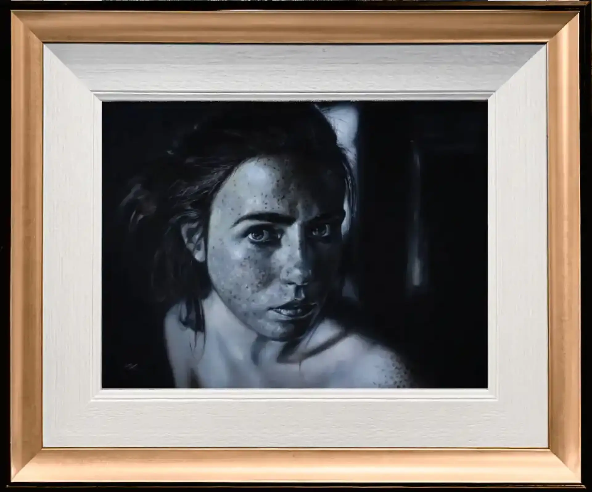 „Adele” autorstwa Włodzimierz Kukliński to intymny, realistyczny portret utrzymany w chłodnej, niemal monochromatycznej tonacji. Twarz młodej kobiety wyłania się z półmroku, modelowana subtelnym światłem, które podkreśla naturalność rysów, delikatność skóry i charakterystyczne piegi.