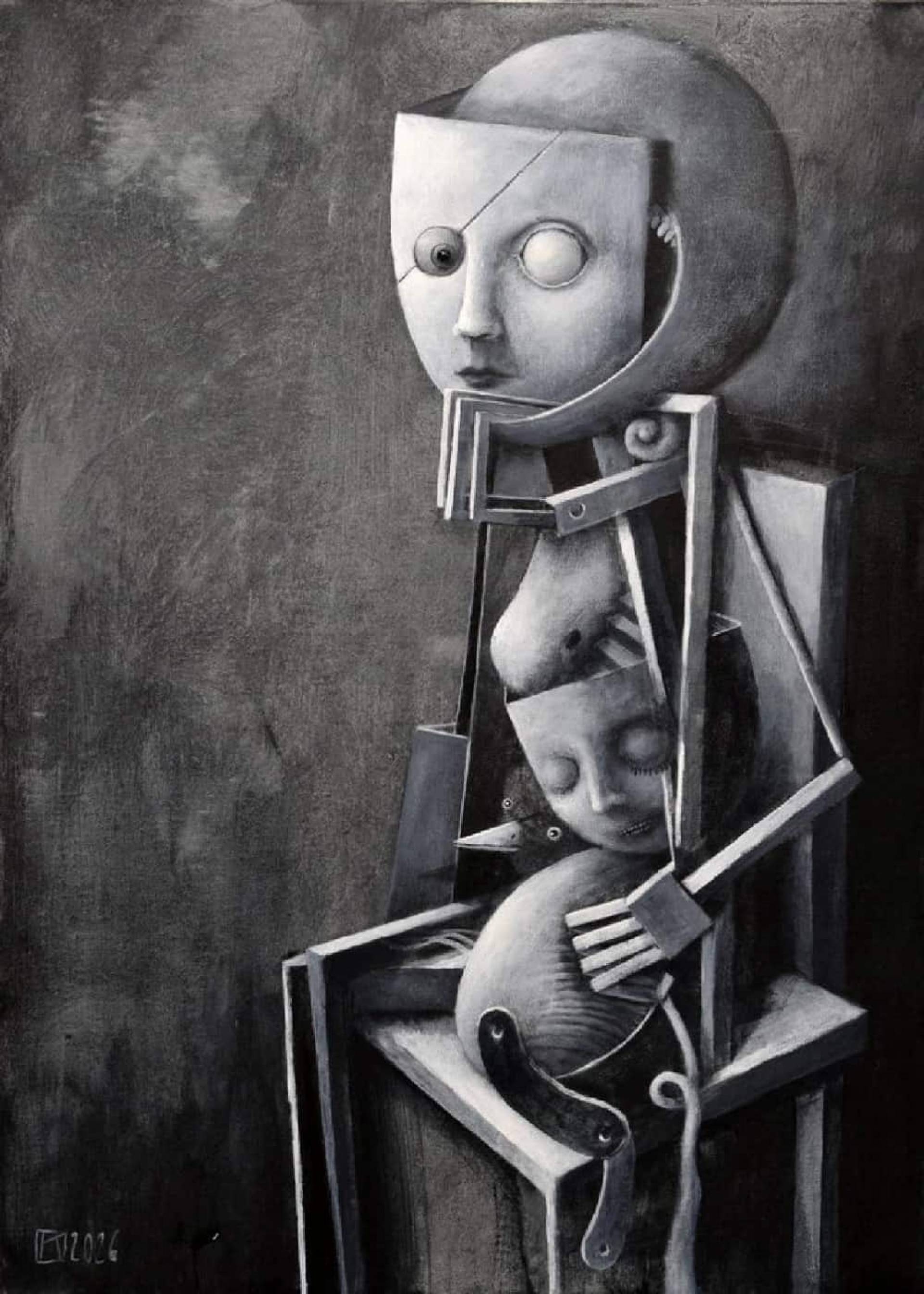 W „Alma Mater” Krzysztof Iwin prezentuje przejmującą, monochromatyczną medytację na temat macierzyństwa, pochodzenia i wewnętrznego dziedzictwa. Siedząca postać kobieca, zbudowana z geometrycznych płaszczyzn i mechanicznych połączeń, kołysze w swoim ciele śpiące dziecko – obraz, który łączy w sobie ochronę i zamknięcie. Kompozycja emanuje zarówno czułością, jak i niepokojem, sugerując macierzyństwo jako przestrzeń architektoniczną i psychologiczną.