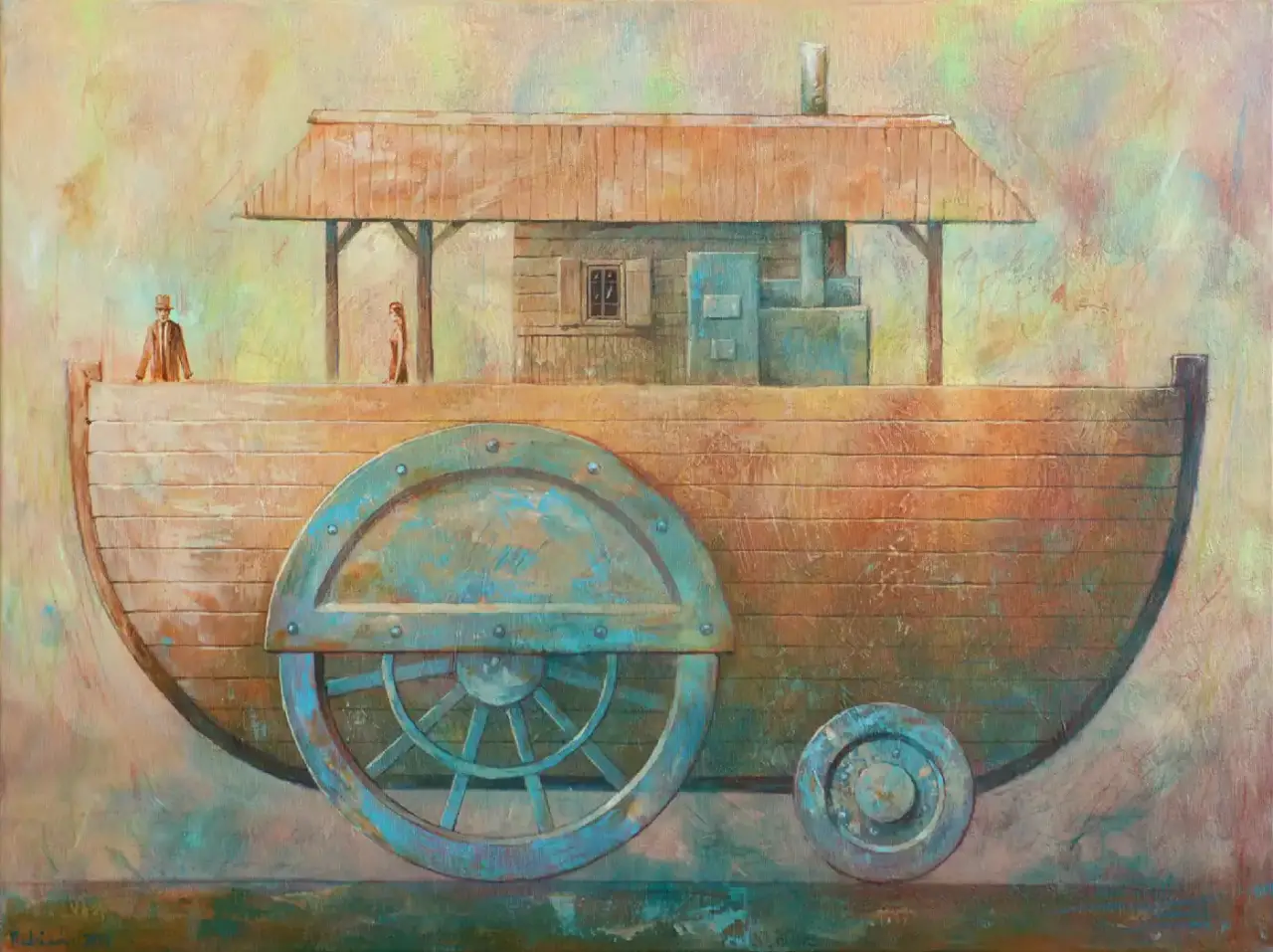 Ta arka nie płynie po wodzie, lecz po czasie. Drewniany kadłub spoczywa na kołach, jakby świat na chwilę zapomniał, czy chce być statkiem, czy domem. Na pokładzie dwie postacie – ciche znaki ludzkiej obecności – mierzą się z drogą, która nie ma mapy. Barwy są przygaszone, jak wspomnienia po deszczu, a błękity i ochry splatają się w obietnicę ocalenia. To obraz o wędrówce bez pośpiechu, o nadziei przewożonej nie przez fale, lecz przez wyobraźnię.