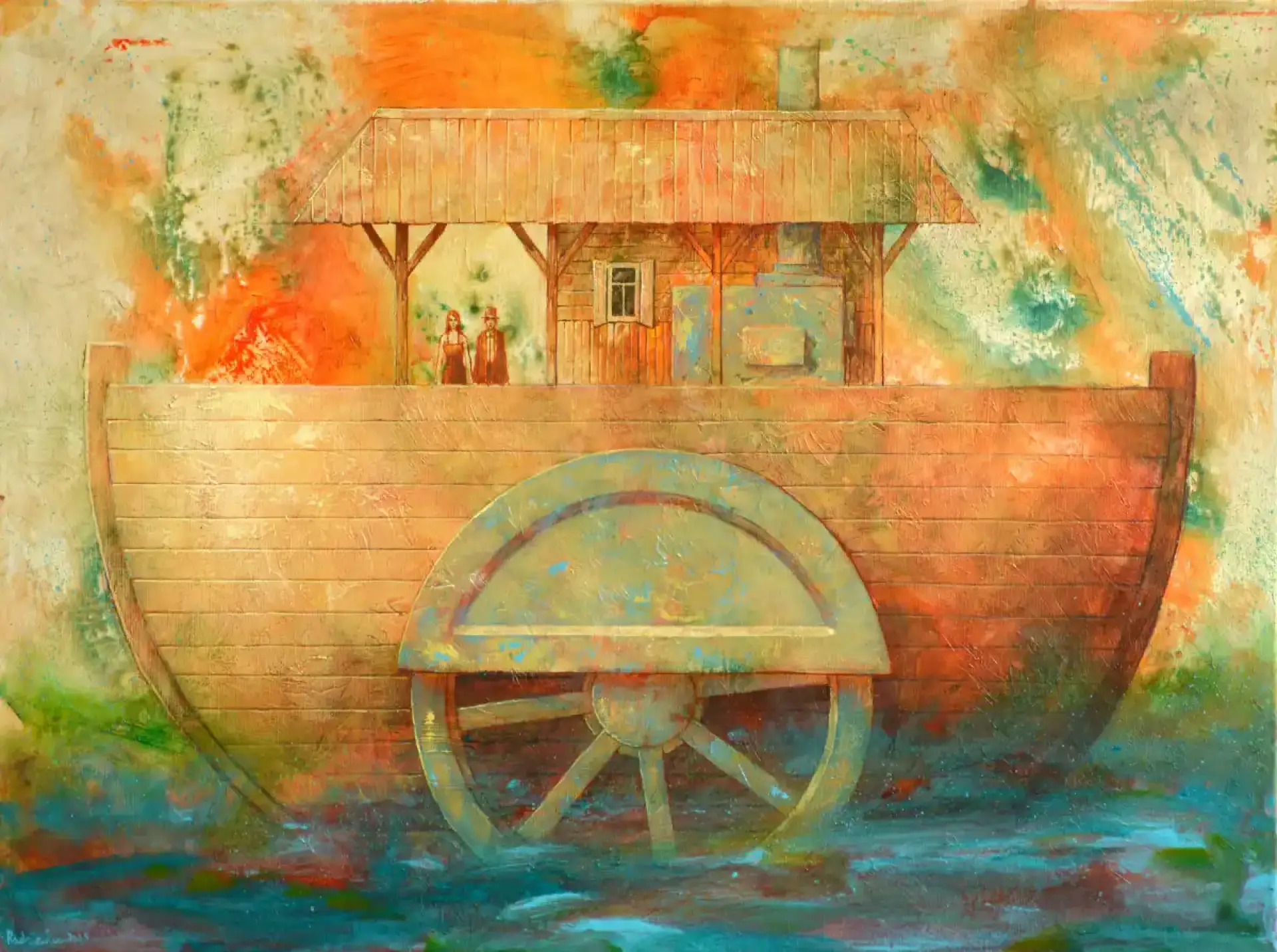 Ta arka nie płynie po wodzie, lecz po czasie. Drewniany kadłub spoczywa na kołach, jakby świat na chwilę zapomniał, czy chce być statkiem, czy domem. Na pokładzie dwie postacie – ciche znaki ludzkiej obecności – mierzą się z drogą, która nie ma mapy. Barwy są przygaszone, jak wspomnienia po deszczu, a błękity i ochry splatają się w obietnicę ocalenia. To obraz o wędrówce bez pośpiechu, o nadziei przewożonej nie przez fale, lecz przez wyobraźnię.