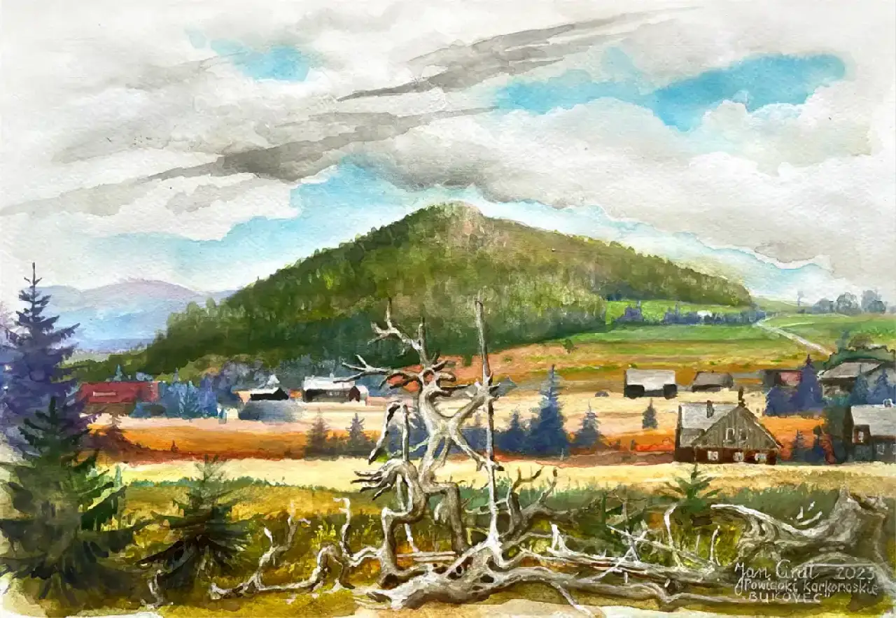 Na pierwszy rzut oka — pejzaż. Cisza gór, rozległe pola, rozrzucone zabudowania pod spokojnym niebem. Lecz w samym sercu akwareli stoi On.