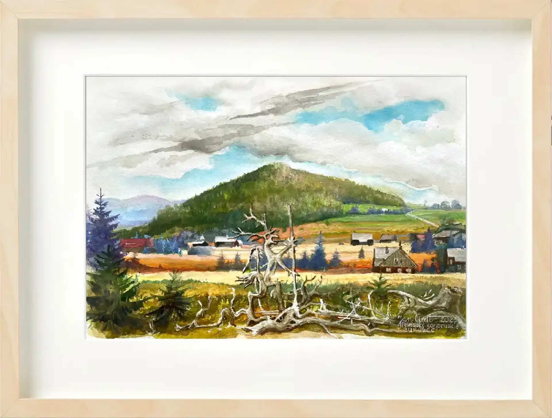 Nie przemawia słowami. Jest obecnością. Strażnikiem pamięci krajobrazu, który widział więcej, niż potrafimy nazwać. W tej akwareli natura sama odsłania swój sekret — pokazuje, że legenda nie została wymyślona, lecz wyrzeźbiona przez czas.