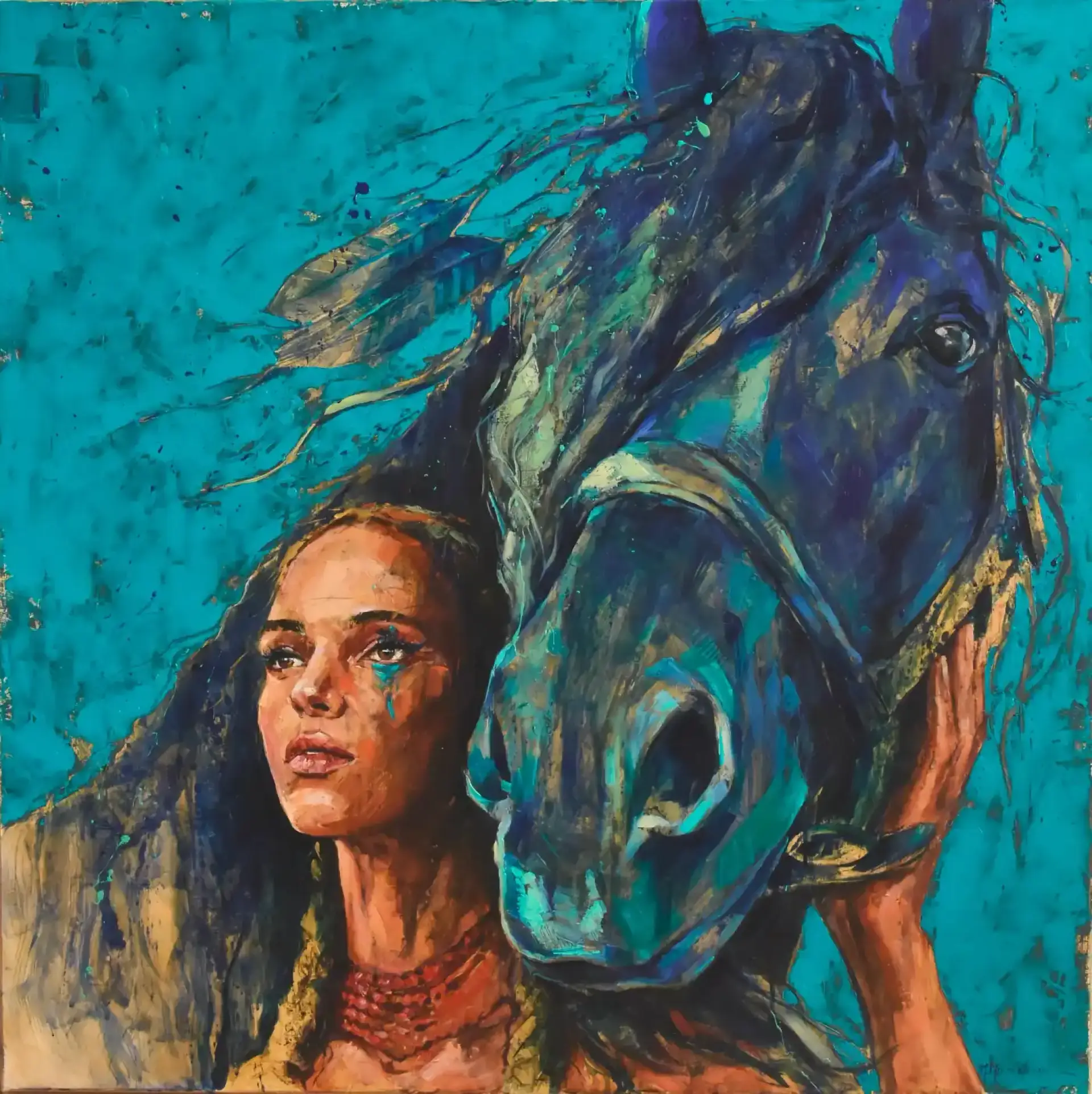 W turkusowej przestrzeni, pulsującej barwą i emocją, spotykają się dwa światy — kobiety i konia. Ich bliskość nie potrzebuje słów; jest jak cichy oddech, jak wspólne trwanie na granicy myśli i instynktu. Twarz kobiety, zamyślona i delikatna, nosi ślad barwnej łzy — jak echo przeżyć, które nie znalazły jeszcze ukojenia. Obok niej koń, potężny, a zarazem łagodny, pochyla się w geście niemal opiekuńczym, jakby rozumiał więcej, niż można wypowiedzieć.