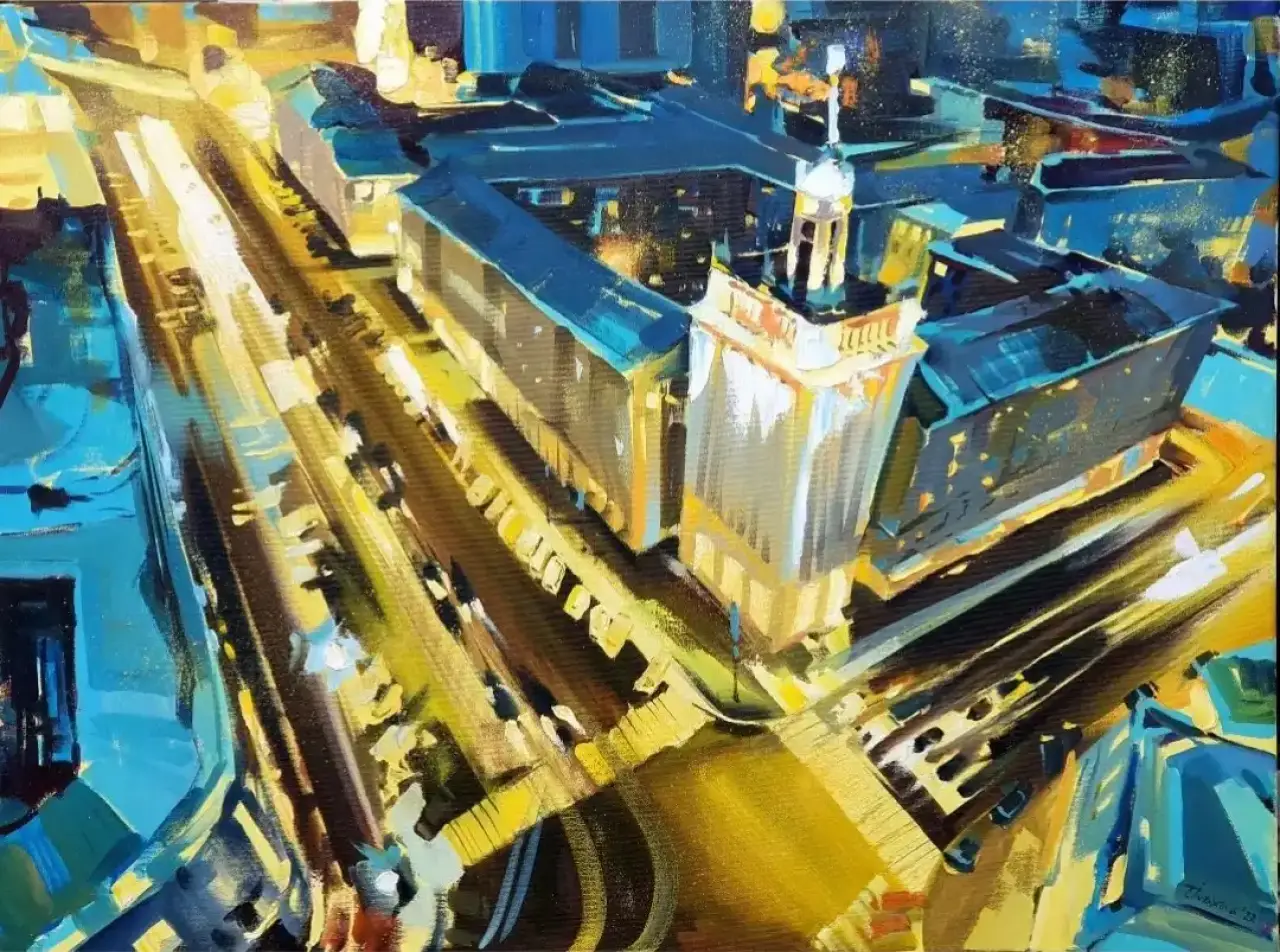 Wieczorny Charków ukazany z lotu ptaka pulsuje światłem i energią miasta. Złote linie ulic kontrastują z chłodnymi błękitami zabudowy, tworząc dynamiczną, nowoczesną kompozycję. Obraz powstał jako zapis miejskiego rytmu i architektonicznej siły Charkowa — dziś odczytywany także jako poruszające wspomnienie miasta sprzed wojennych zniszczeń i symbol jego trwania.