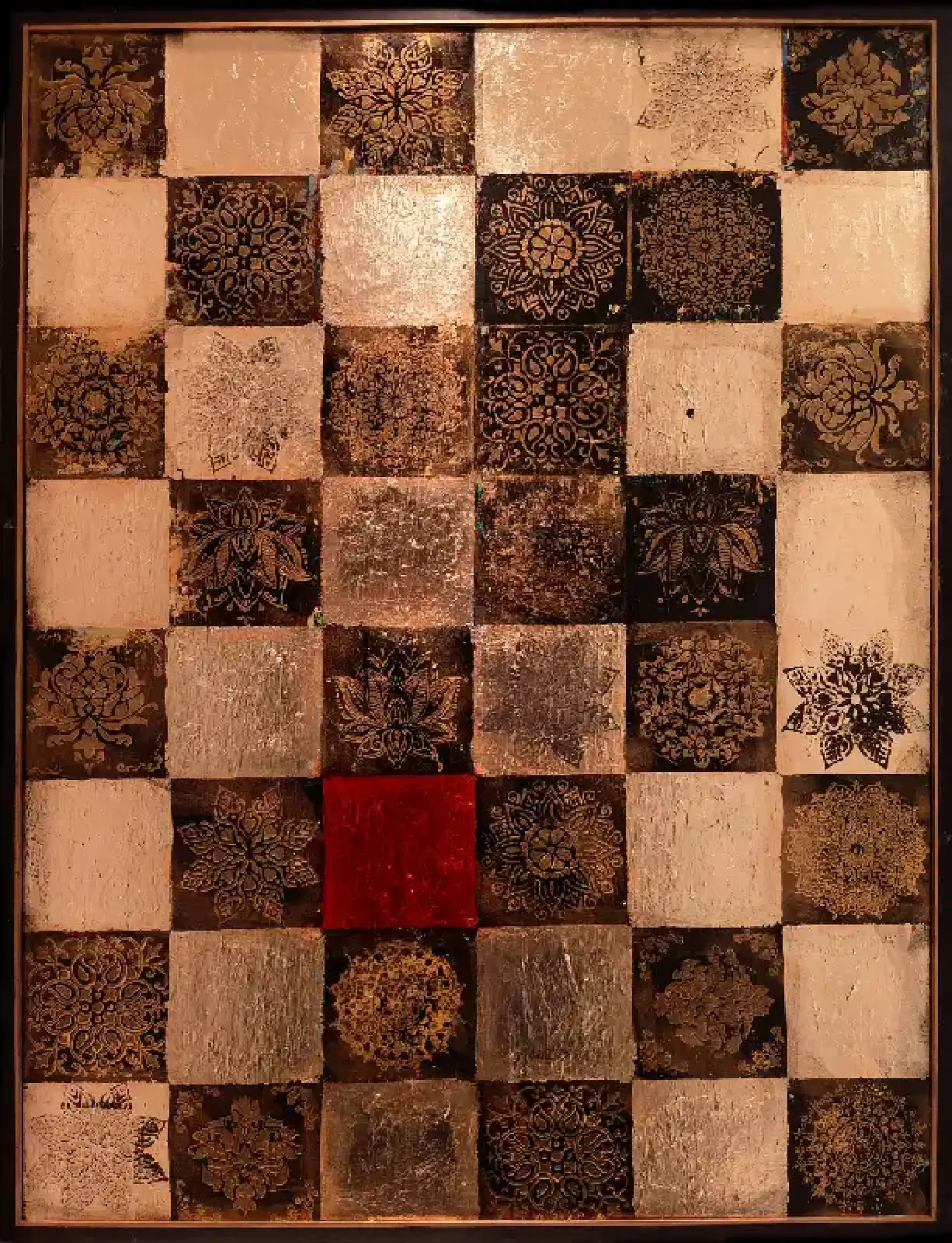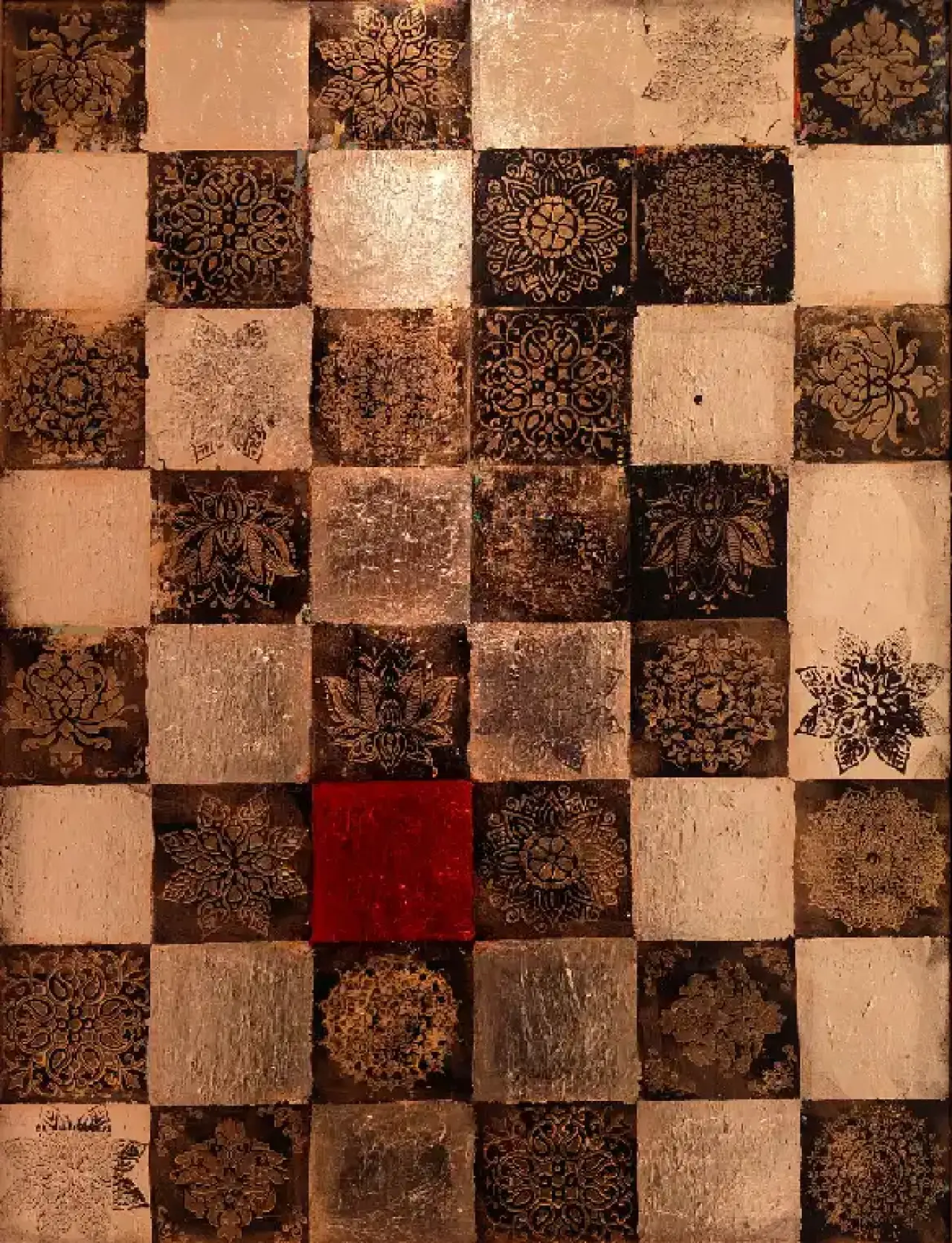 Na płótnie rozkłada się regularna szachownica kwadratów w kości słoniowej, brązach i złotawyh połyskach, nagle przecięta plamą nasyconej czerwieni. Każde ciemne pole niesie rozetę, mandalę albo filigranowy ornament, jakby odbity stemplem i lekko przetarty. Widzę kwadraty i błyszczą jak skarb. Powierzchnia chropawa, miejscami jak złocenie, gdzie indziej mat, więc światło tańczy i mruga. Atmosfera jest ciepła i trochę ceremonialna, ale te czerwienie wprowadzają drobny niepokój, taki pstryk. Styl miesza dekor z geometrią, może mixed media, trochę patyny, trochę szablonów, a nawet odrobina przypadku. Serio lubię ten rytm, uspokaja, a jednak akcenty robią bold kontrapunkt. Czuję, że to opowieść o porządku, w którym zawsze znajdzie się odwaga na małe zboczenie z trasy. Tak to widzę, no i prosze, może jutro odkryję w tym inny wzór.