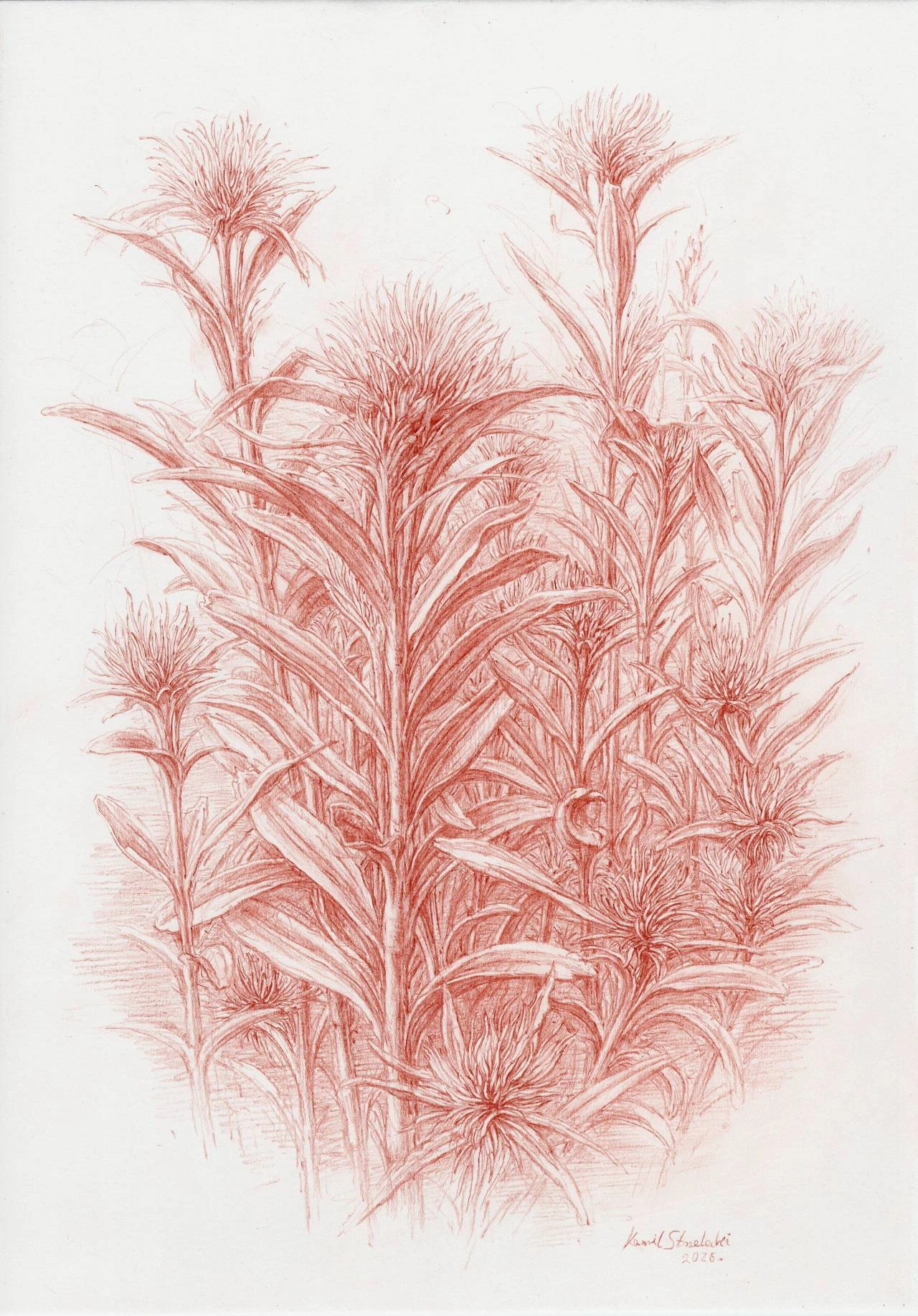 Na białej ciszy papieru wyrasta ogród zbudowany z oddechów i linii. Goździk brodaty nie krzyczy kolorem. Każda kreska sangwiny jest jak puls pod skórą rośliny, jak pamięć lata zapisana delikatnym drżeniem dłoni. Kwiaty unoszą się lekko, niepewne własnej materialności, jakby za chwilę miały rozpłynąć się w świetle. To botaniczny portret skupienia: natura zatrzymana na moment przed tym, nim znów zacznie rosnąć.