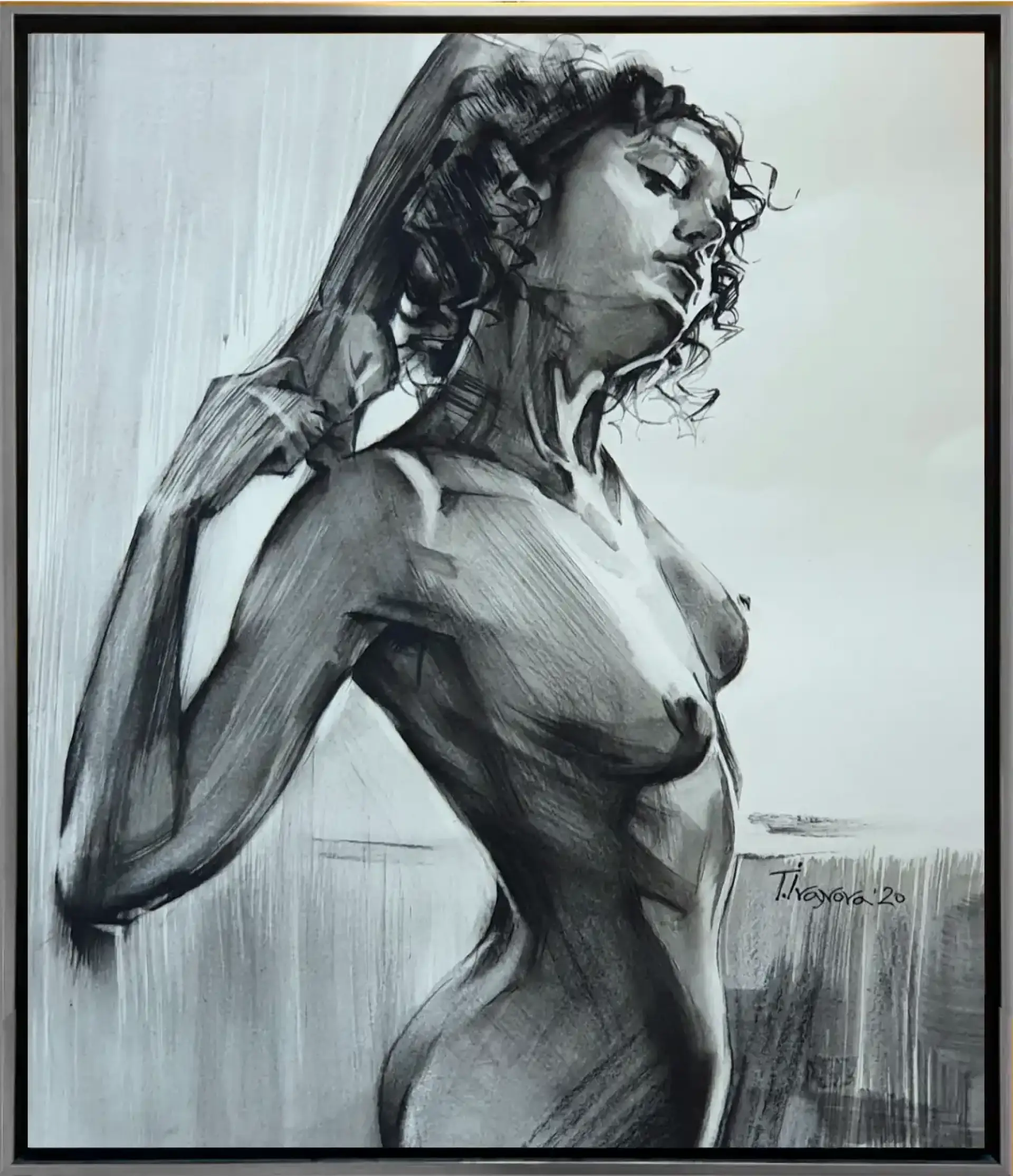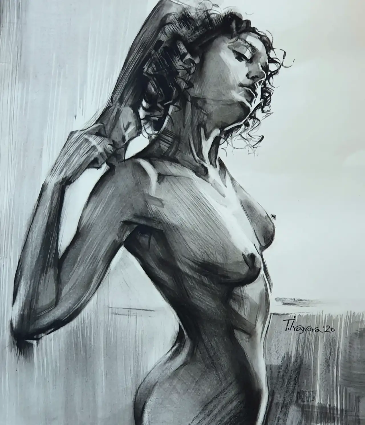 Ciało kobiety unosi się w ciszy poranka niczym rzeźba wyrzeźbiona światłem. Jej sylwetka, zbudowana z miękkich cieni i śmiałych linii, przypomina melodię zapisaną w grafitowych nutach. Podniesione ramię odsłania napięcie mięśni, jakby w tym jednym geście mieściła się cała intymność przebudzenia. Włosy spływają swobodnie, niesione niewidzialnym wiatrem, a spojrzenie – pełne dumy i delikatnego dystansu – zamyka widza w chwili, która nie potrzebuje słów. To obraz, który oddycha spokojem, kruchością i siłą jednocześnie.
