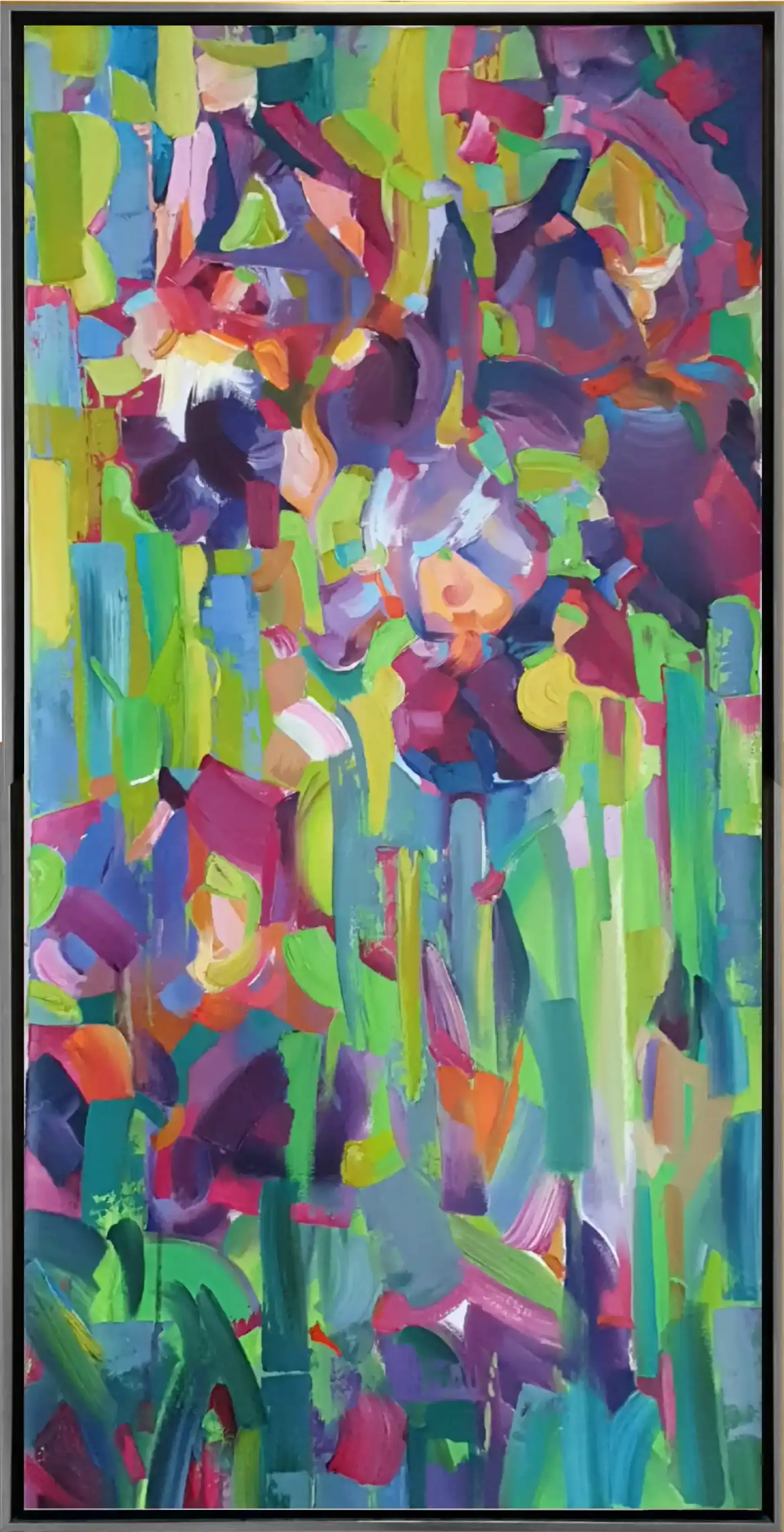 Kolory wyrastają tu jak irysy po deszczu — gęste, śmiałe, pulsujące życiem. Pociągnięcia pędzla układają się w pionowy rytm, jakby ziemia oddychała barwą, a kwiaty nie miały konturów, tylko energię. Zieleń, fiolet i turkus przenikają się bez granic, tworząc wrażenie ruchu i światła. To nie portret irysów, lecz ich wspomnienie — emocja chwili, gdy ogród staje się czystą radością malowania.