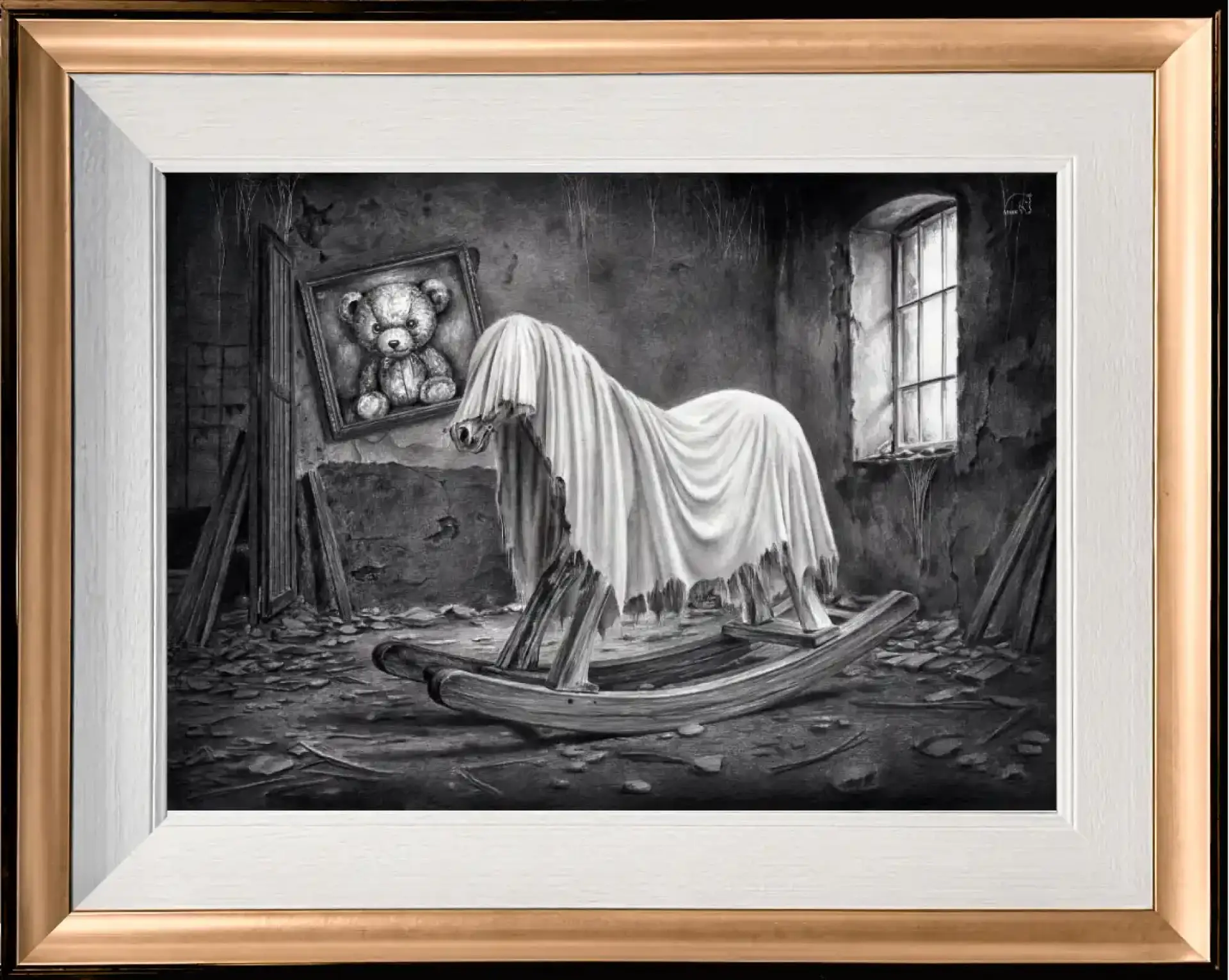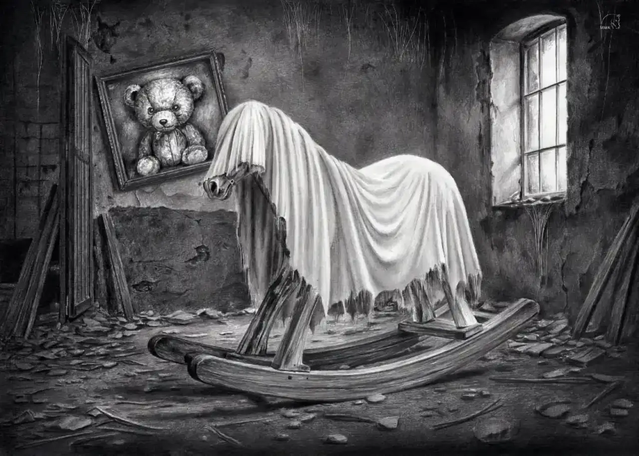 „Konik Apokalipsy” autorstwa Magdalena Muraszko-Kowalska to przejmująca, symboliczna kompozycja utrzymana w monochromatycznej estetyce rysunku ołówkiem. W centrum znajduje się dziecięcy konik na biegunach, okryty ciężką, postrzępioną tkaniną, która nadaje mu niemal widmowy charakter. Scena rozgrywa się w zrujnowanym, opuszczonym wnętrzu – spękane ściany, porozrzucane deski i surowe światło wpadające przez okno budują atmosferę niepokoju i pustki.