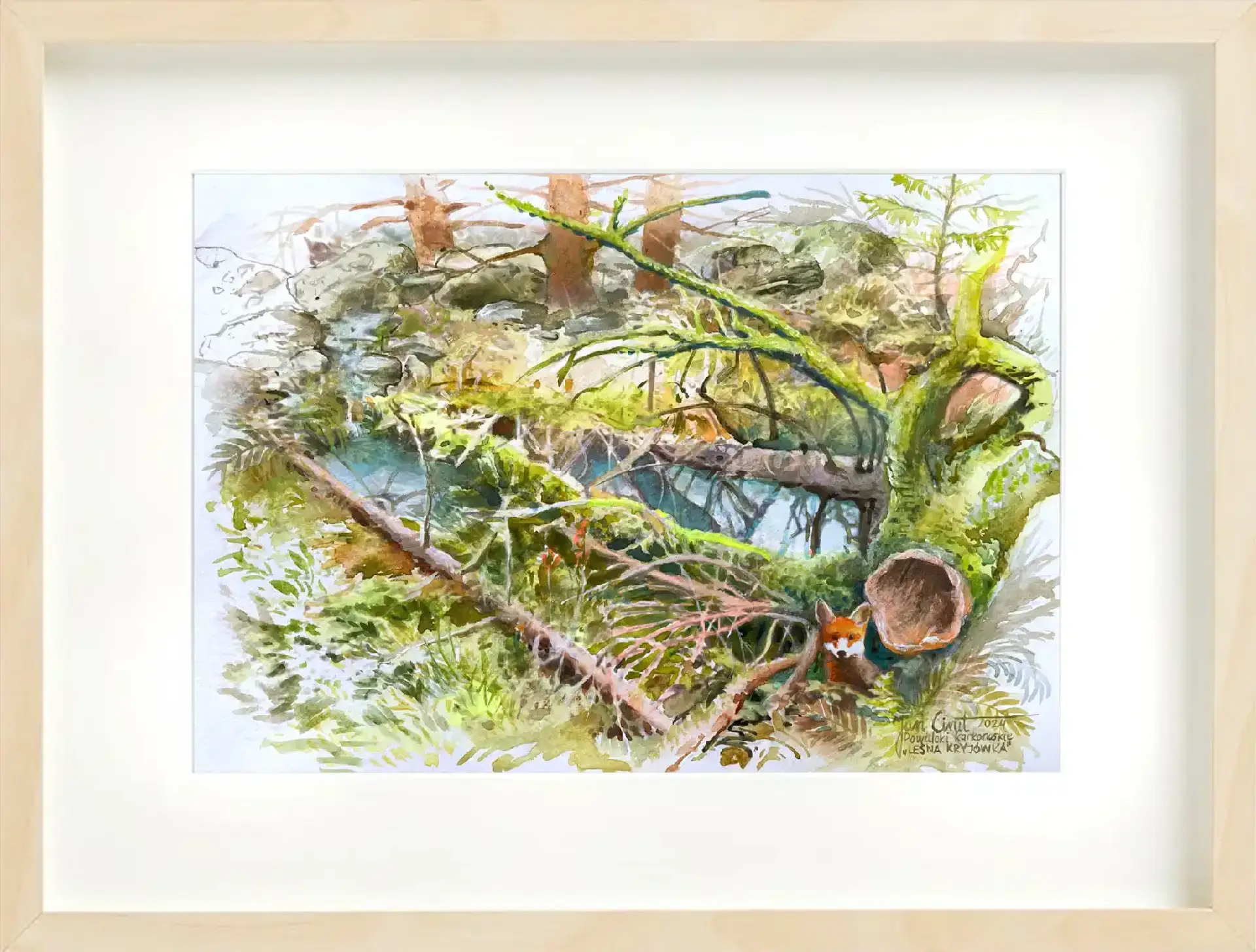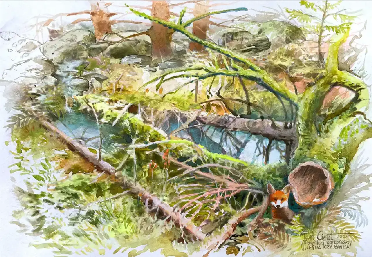 W zielonej ciszy splątanych gałęzi czas zwalnia krok, jakby sam las nabierał oddechu. Pnie i konary, porośnięte mchem niczym starą brodą ziemi, tworzą naturalną katedrę, w której światło sączy się jak szept. A tam, w półmroku — lis, rudy strażnik tajemnicy, wygląda z kryjówki, jakby pilnował sekretów Karkonoszy zapisanych w liściach i korze.