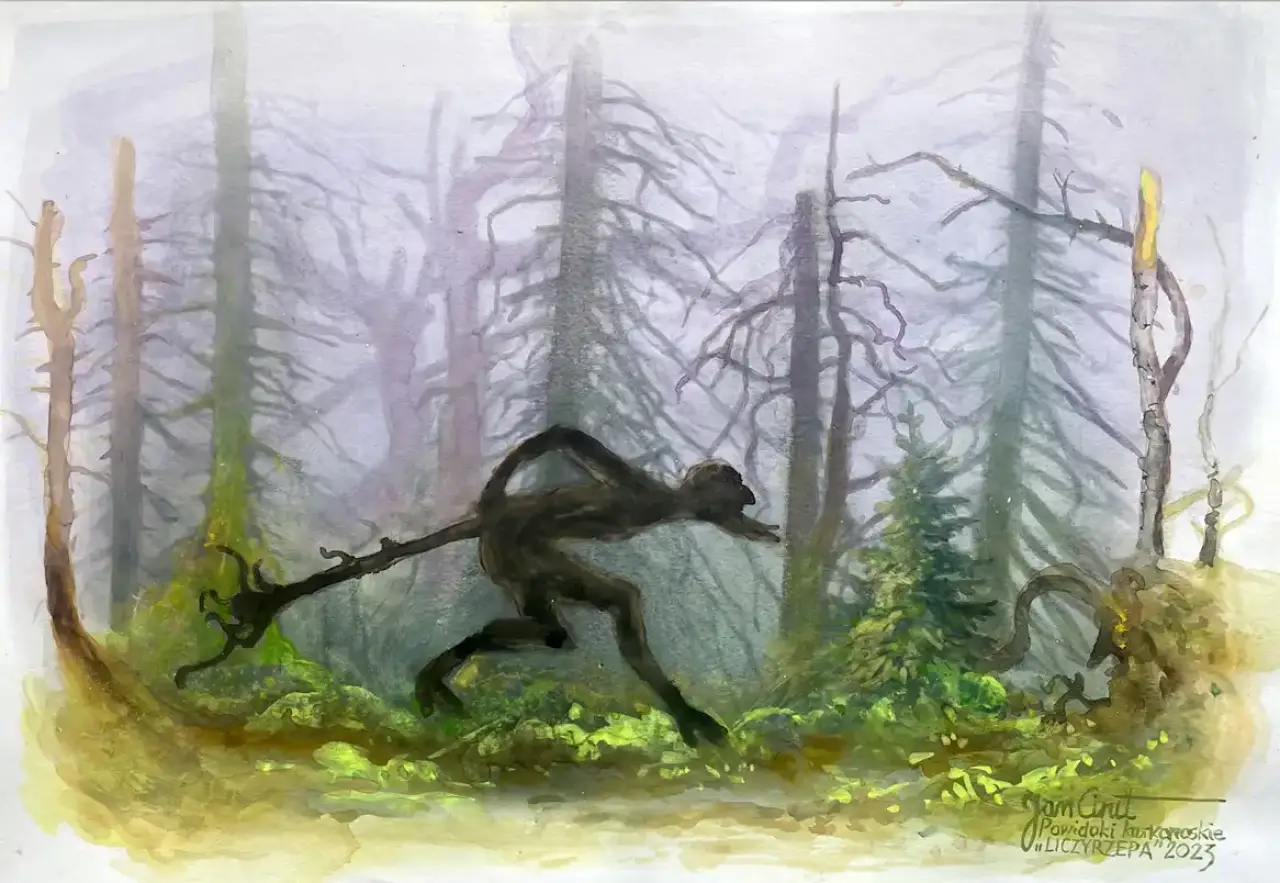 Z wilgotnej głębi lasu wyłania się Liczyrzepa — nie tyle postać, co poruszenie samej puszczy. Jego ciało zdaje się splecione z korzeni, gałęzi i cienia; krok ma długi, niespokojny, jakby ziemia ledwie nadążała za jego myślą. Martwe pnie stoją wokół niczym świadkowie dawnego kataklizmu, a mgła zawiesza czas między tym, co było, a tym, co wciąż straszy wyobraźnię. Zieleń mchu jarzy się nienaturalnie, jakby las oddychał własnym, nie do końca ludzkim rytmem. To wizja karkonoskiego mitu — dzika, nieoswojona, bardziej przeczuwana niż zobaczona.