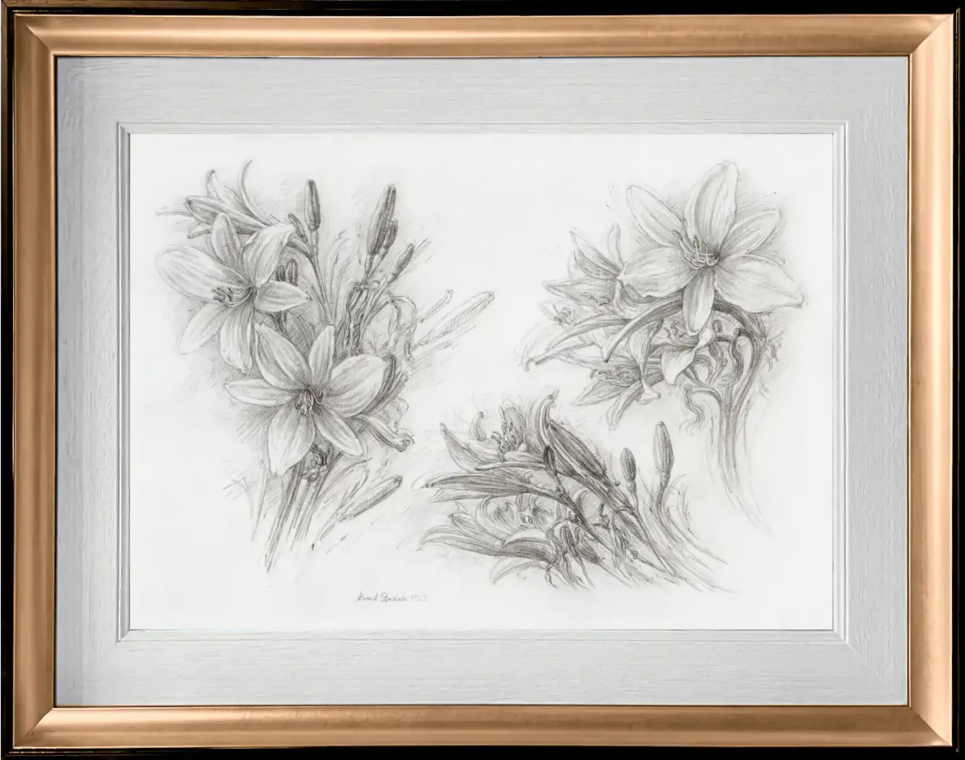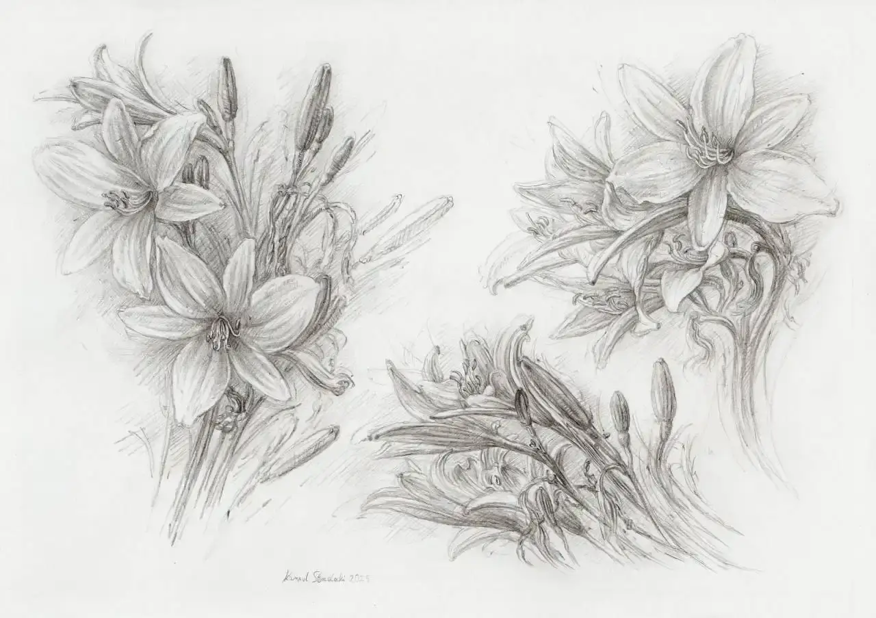 Lilie, rysunek czarna kredką, format do oprawy 29x42cm, rysunek bez oprawy.