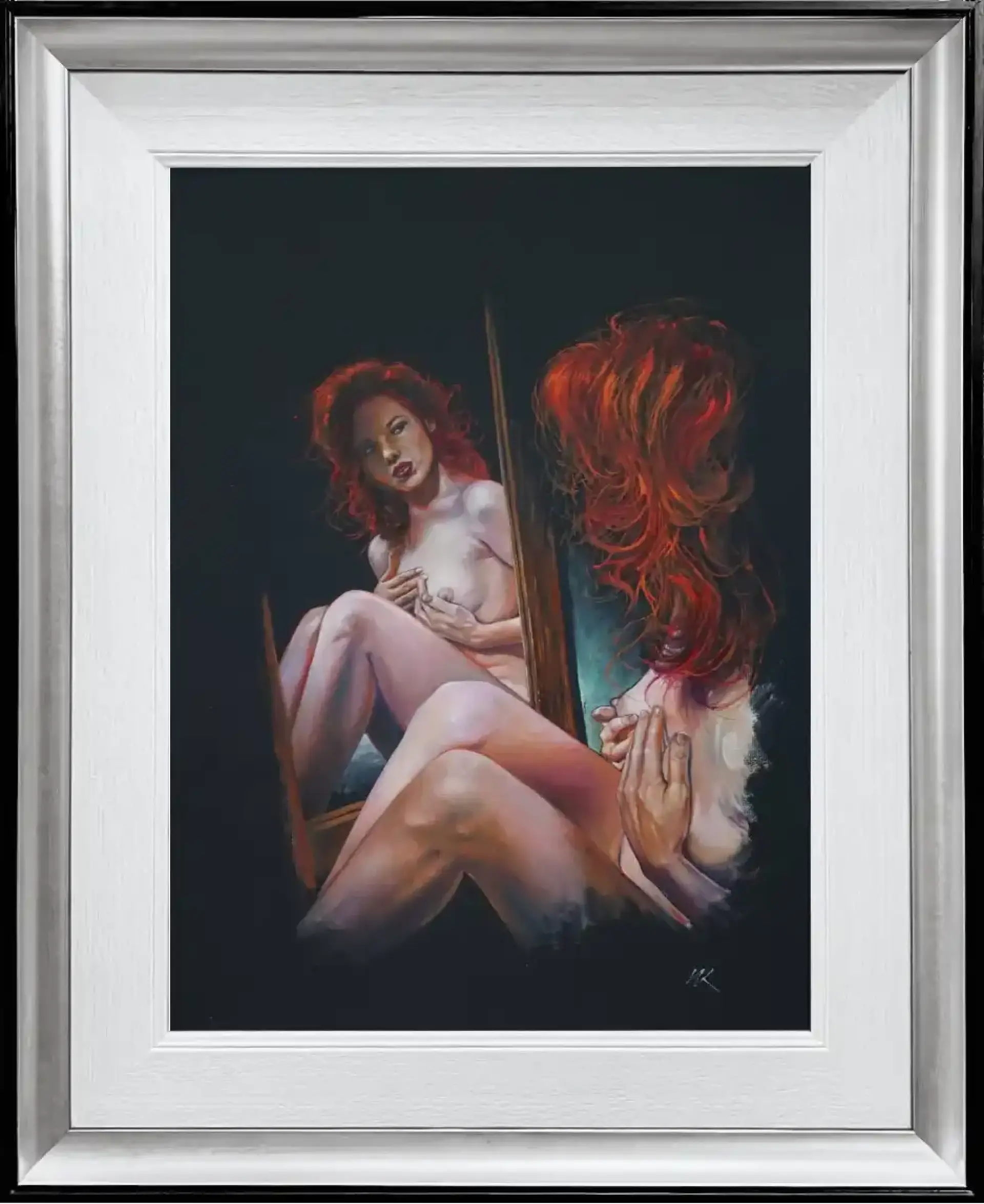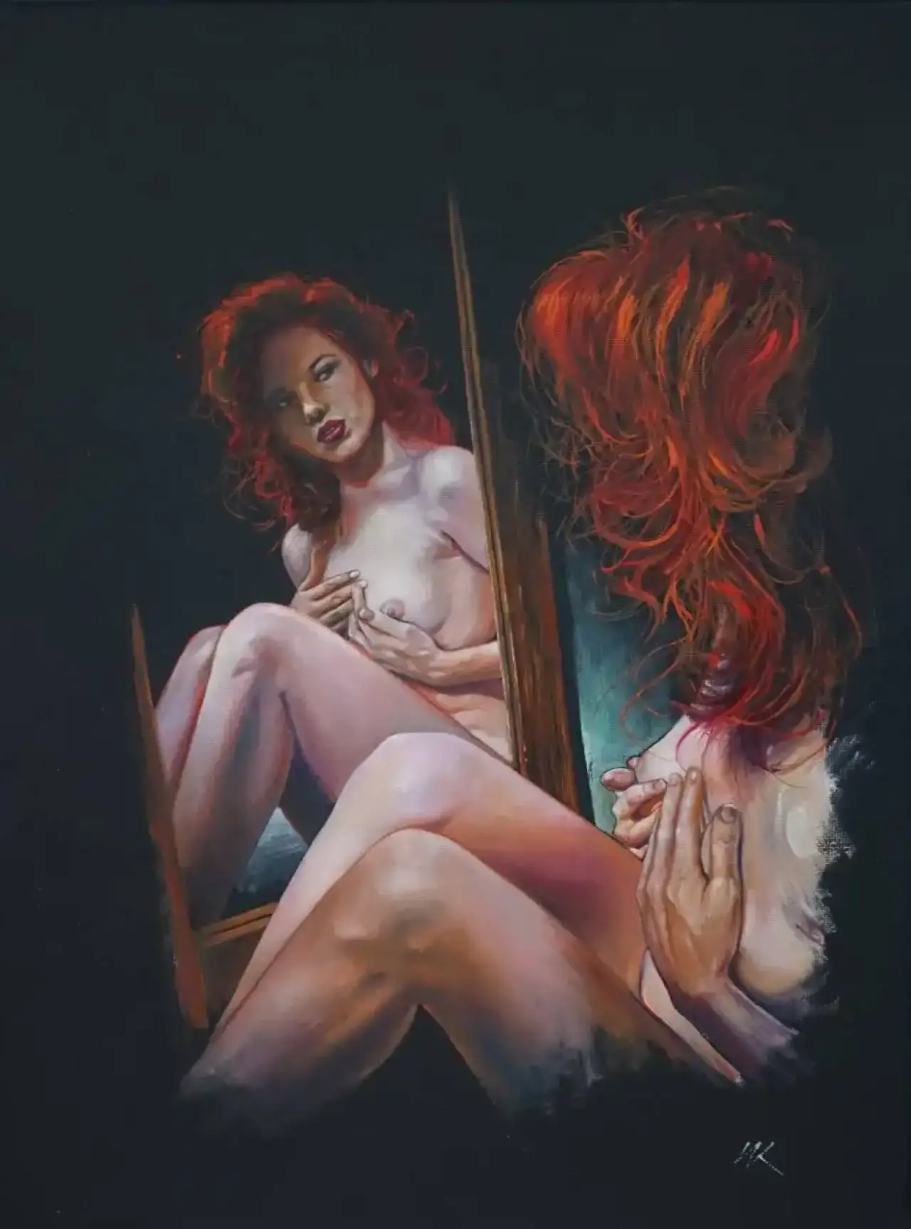 Ciepłe, zmysłowe światło podkreśla miękkość ciała i intensywność rudych włosów, kontrastując z ciemnym, niemal pustym tłem. Gest dłoni – zarówno w realnej postaci, jak i w odbiciu – sugeruje próbę ochrony, ale też potrzebę zrozumienia samej siebie.