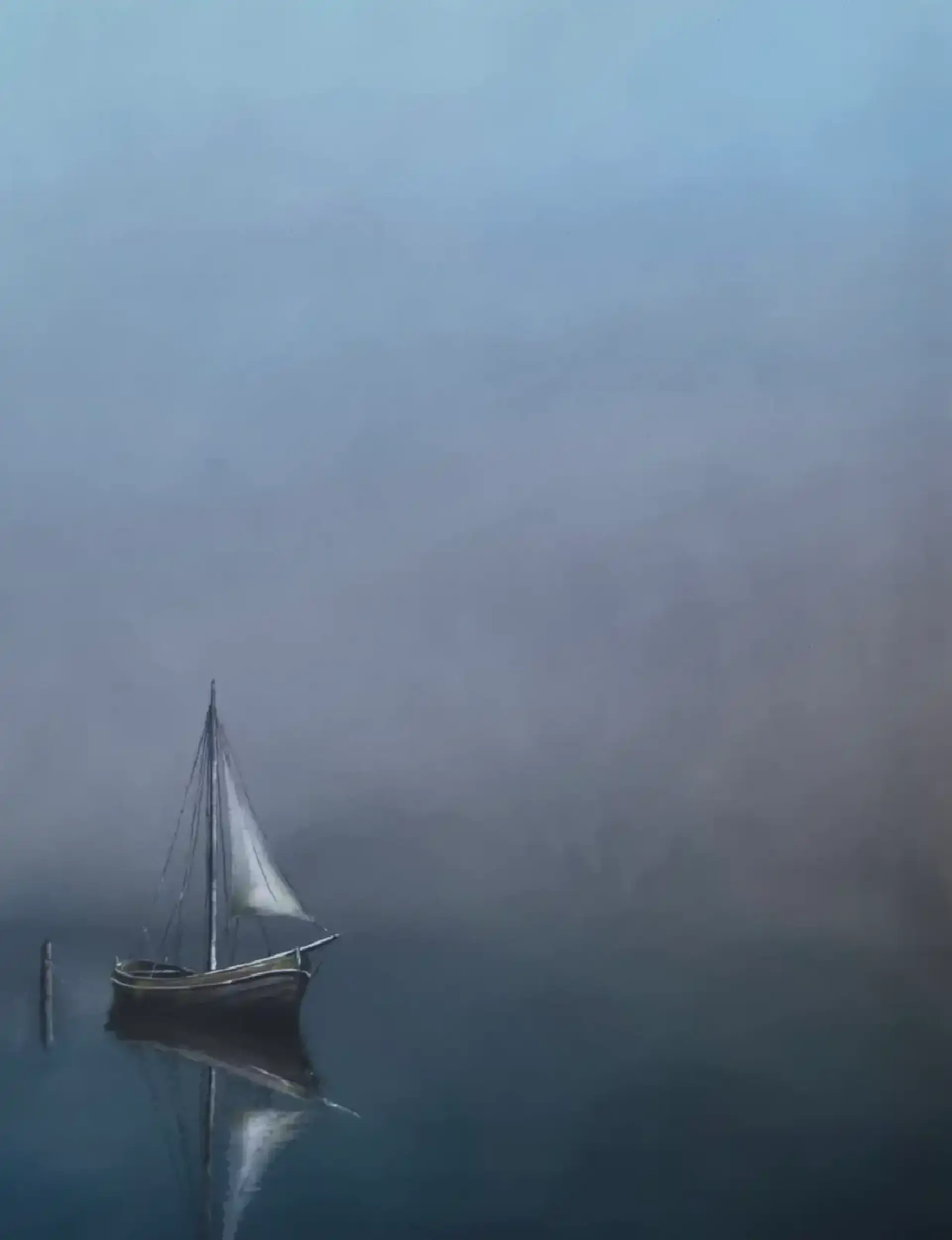 Z mgły wyłania się cisza. Niewielka łódź żaglowa trwa nieruchomo przy palu, jakby zapomniała, po co wyrusza się w drogę. Woda jest gładka jak wstrzymany oddech, odbija kadłub i żagiel z delikatną niepewnością, jak wspomnienie, które nie chce się utrwalić. Chłodne błękity i szarości rozmywają granice między niebem a taflą jeziora — wszystko zdaje się zawieszone pomiędzy „jeszcze” a „już nie”. To obraz o czekaniu, o samotności łagodnej jak mgła i o przystani, która bardziej jest stanem ducha niż miejscem.
