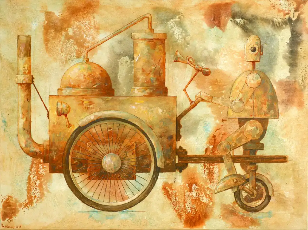 To maszyna, która oddycha rdzą i snem. Jednokołowy parowy brzuch niesie w sobie alchemię codzienności, a rury wiją się jak myśli tuż przed świtem. Mechaniczny człowiek, pół-narzędzie, pół-intencja, dmie w trąbkę, jakby ogłaszał początek cichego eksperymentu: destylację czasu. Złoto i miedź spierają się z błękitami, a wszystko drga w zawieszeniu — między ruchem a pauzą, między wynalazkiem a bajką. To poezja techniki, która uwierzyła, że może mieć duszę.