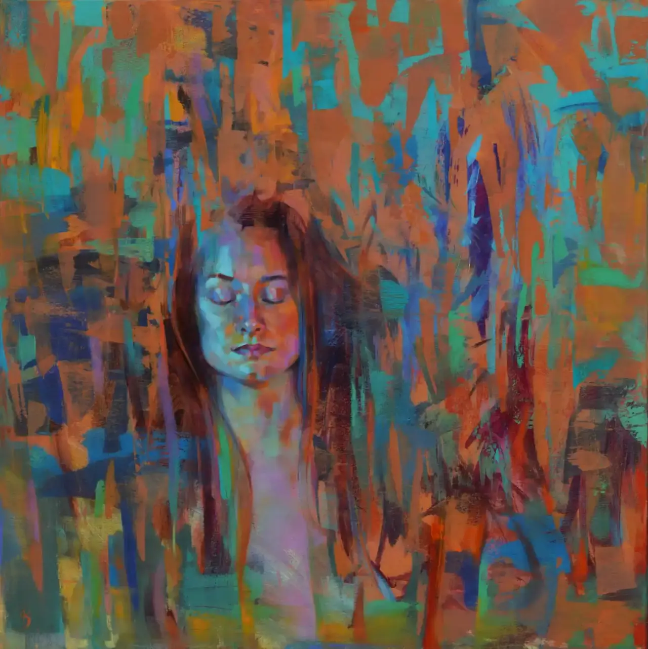 Z obrazu wyłania się twarz kobiety, jakby zanurzona w miękkim nurcie barw — zamknięte oczy sprawiają, że wygląda, jakby słuchała własnego oddechu ukrytego pod warstwami farby. Turkusy, pomarańcze i fiolety spływają w dół niczym strumienie myśli, swobodne i nieujarzmione, splecione z delikatnością jej rysów. Cała kompozycja pulsuje jak żyjąca mapa emocji: raz spokojna, raz rozedrgana, zawsze prawdziwa. To portret ciszy pośród chaosu — momentu, w którym świat zostaje za drzwiami, a wewnętrzne światło świeci najjaśniej.