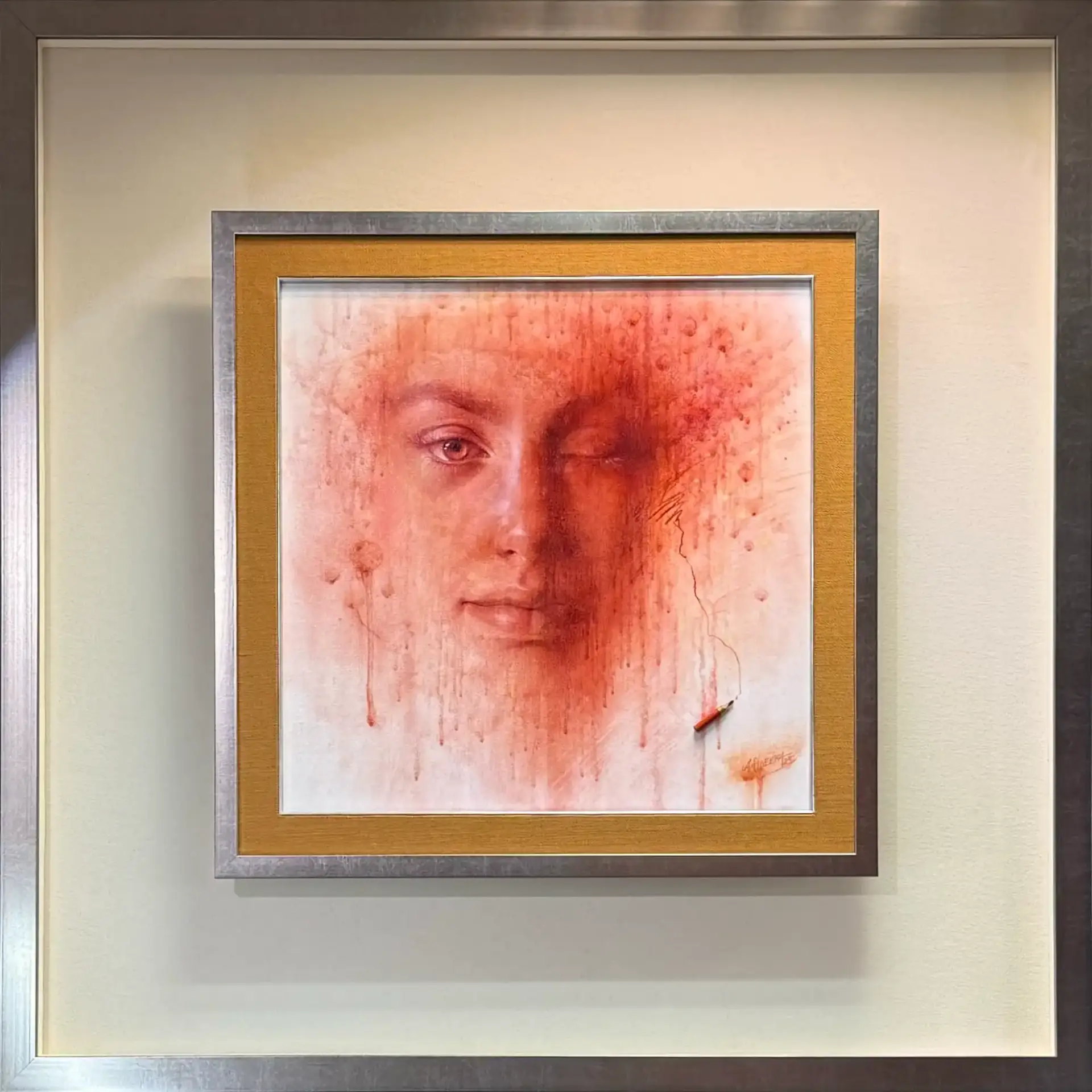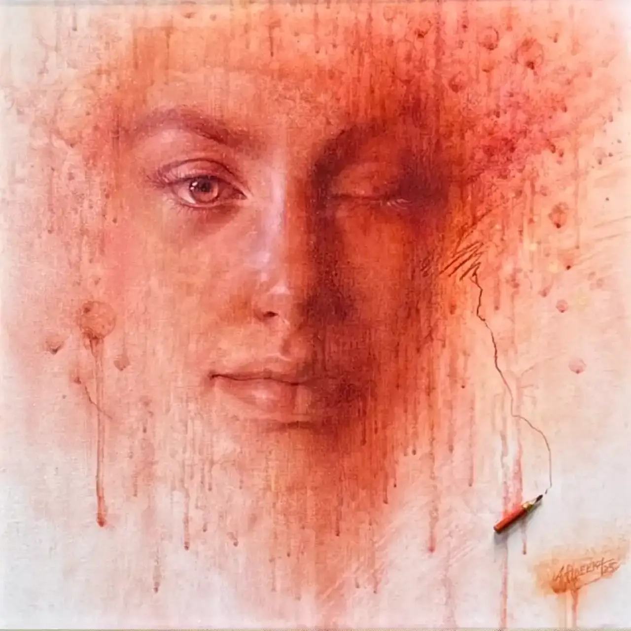 Subtelny portret kobiecej twarzy wyłania się z jasnego tła, jakby dopiero kształtował się w przestrzeni. Jedno oko pozostaje otwarte i przenikliwe, drugie niknie w ciepłej czerwieni, która spływa po policzku w formie miękkich, rozmytych smug. Delikatny modelunek światła i cienia kontrastuje z ekspresyjnymi zaciekami barwy, nadając kompozycji emocjonalną głębię. W dolnej części widoczny fragment kredki podkreśla proces twórczy i wrażenie niedokończenia. To obraz o ciszy, napięciu i tym, co pozostaje między słowami — o tytułowym niedopowiedzeniu.