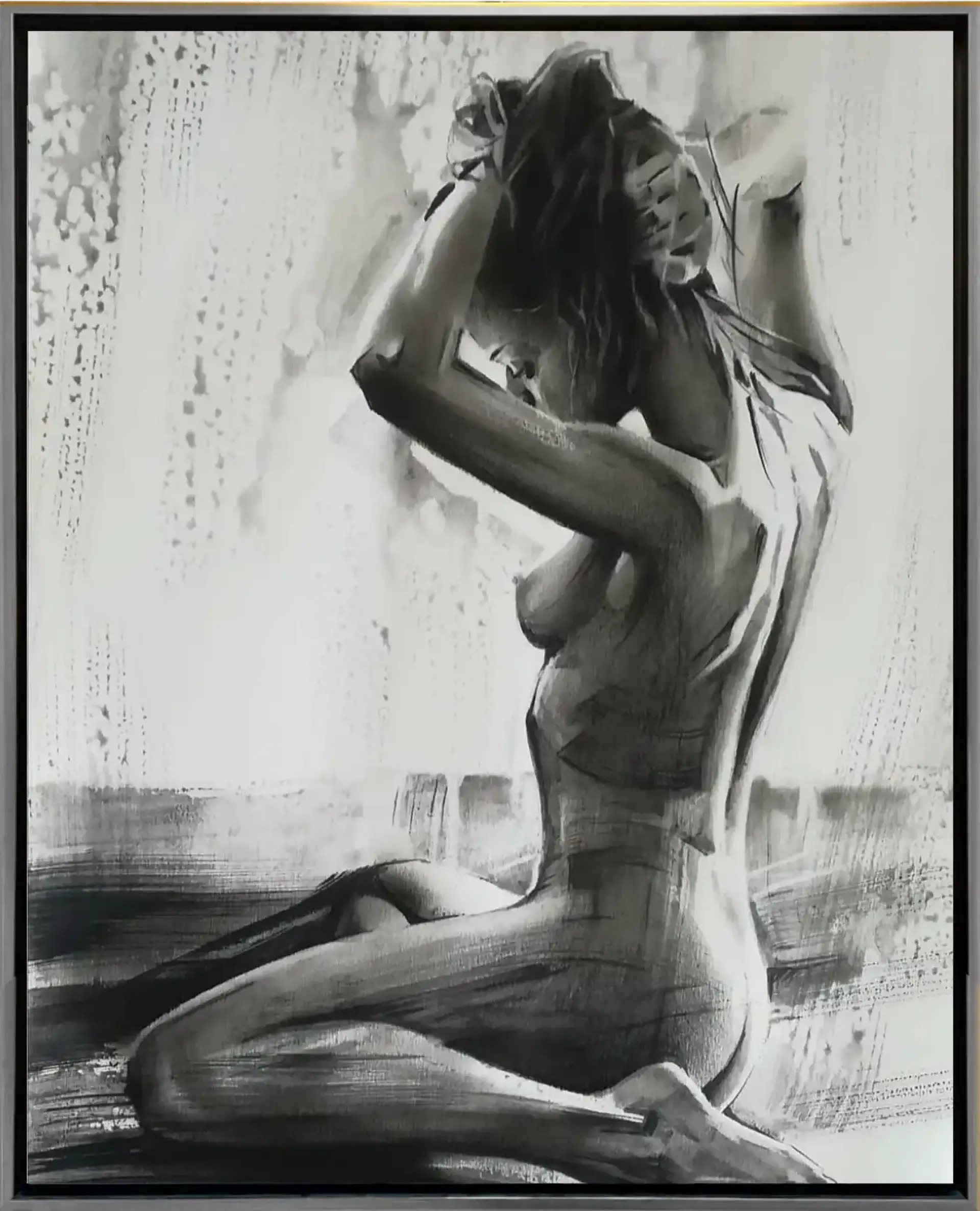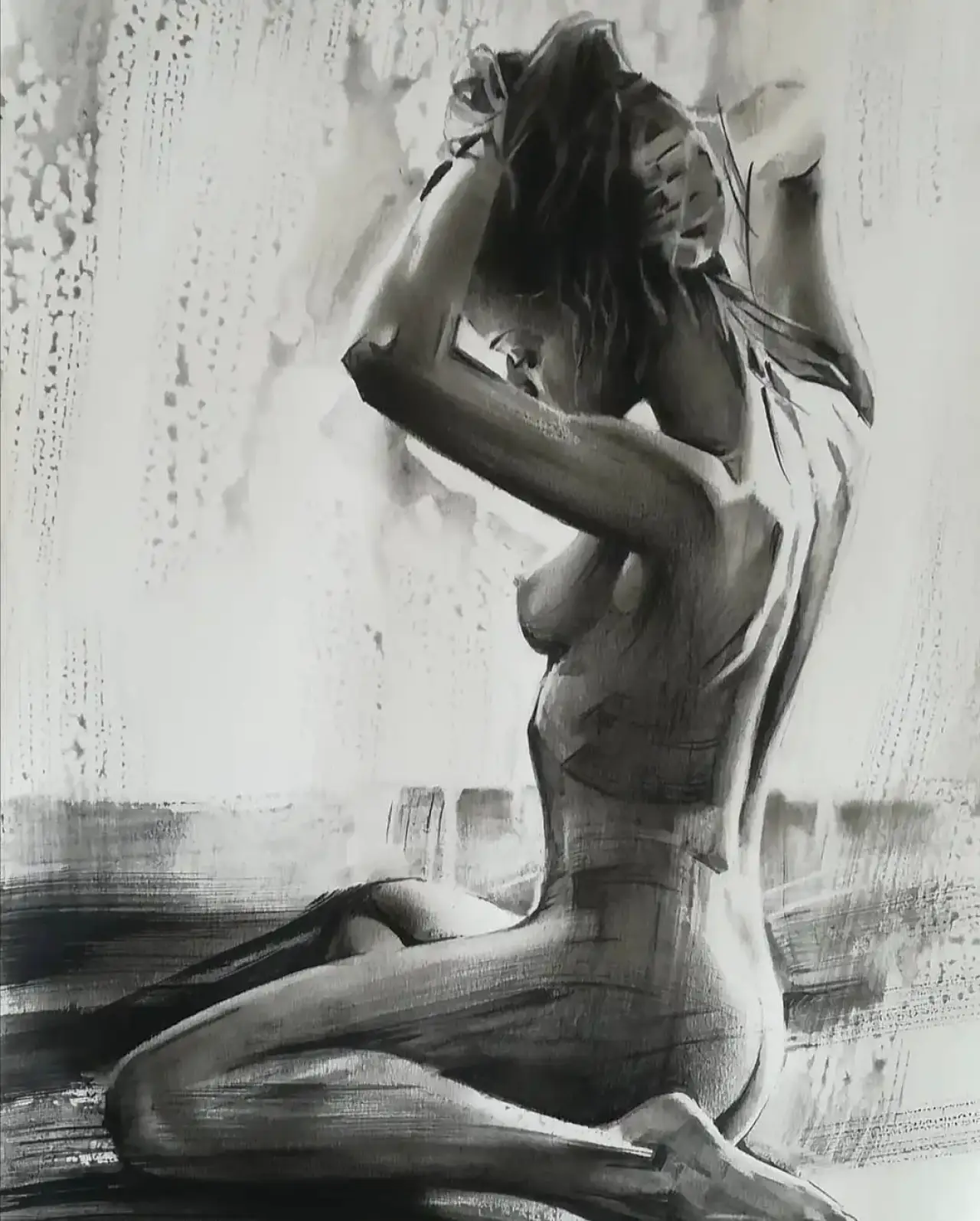 „Nu2” – Ona siedzi w miękkim półmroku, jakby zanurzona w ciszy własnych myśli. Jej sylwetka, zbudowana z pulsujących smug węgla, układa się w harmonijny łuk — delikatny, lecz pełen wewnętrznej siły. Uniesione ręce splatają się w geście układania włosów, przypominając ruch porannego przebudzenia lub chwilę oczyszczenia. Światło rozlewa się po ciele jak srebrna mgła, podkreślając jego rytm i naturalność. Tło, pełne miękkich, abstrakcyjnych plam, otula postać jak cichy oddech przestrzeni. To moment intymny i nieruchomy, w którym widać zarówno kruchość, jak i pewność bycia.
