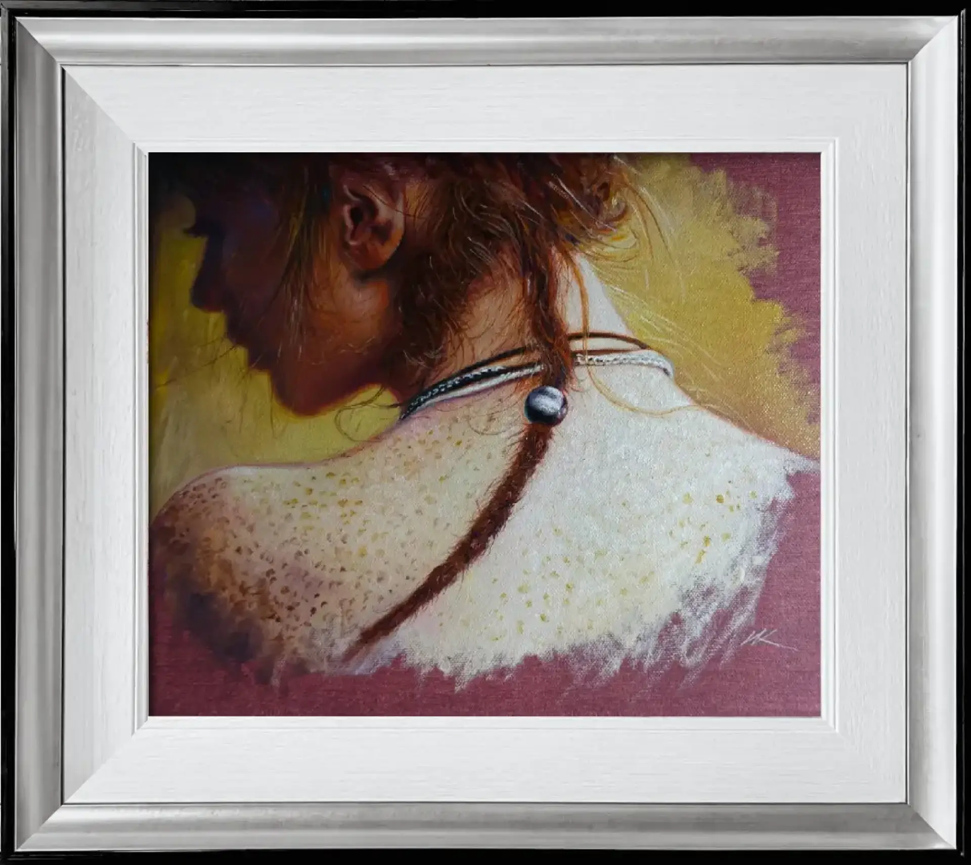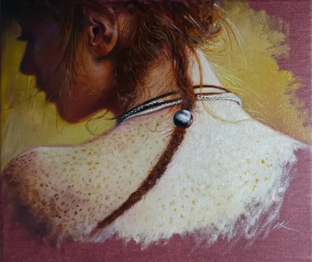 To portret szeptu i dotyku. Twarz uchwycona półprofilem znika w cieniu, jakby chroniła swoją tajemnicę, a cała opowieść skupia się na karku i delikatnym „ogonku” włosów — drobnym geście intymności. Skóra oddycha światłem, muśnięta ciepłem żółci i ciszą różu. Ten obraz nie patrzy wprost — on zaprasza, by się zbliżyć, zatrzymać i posłuchać tego, co niewypowiedziane.