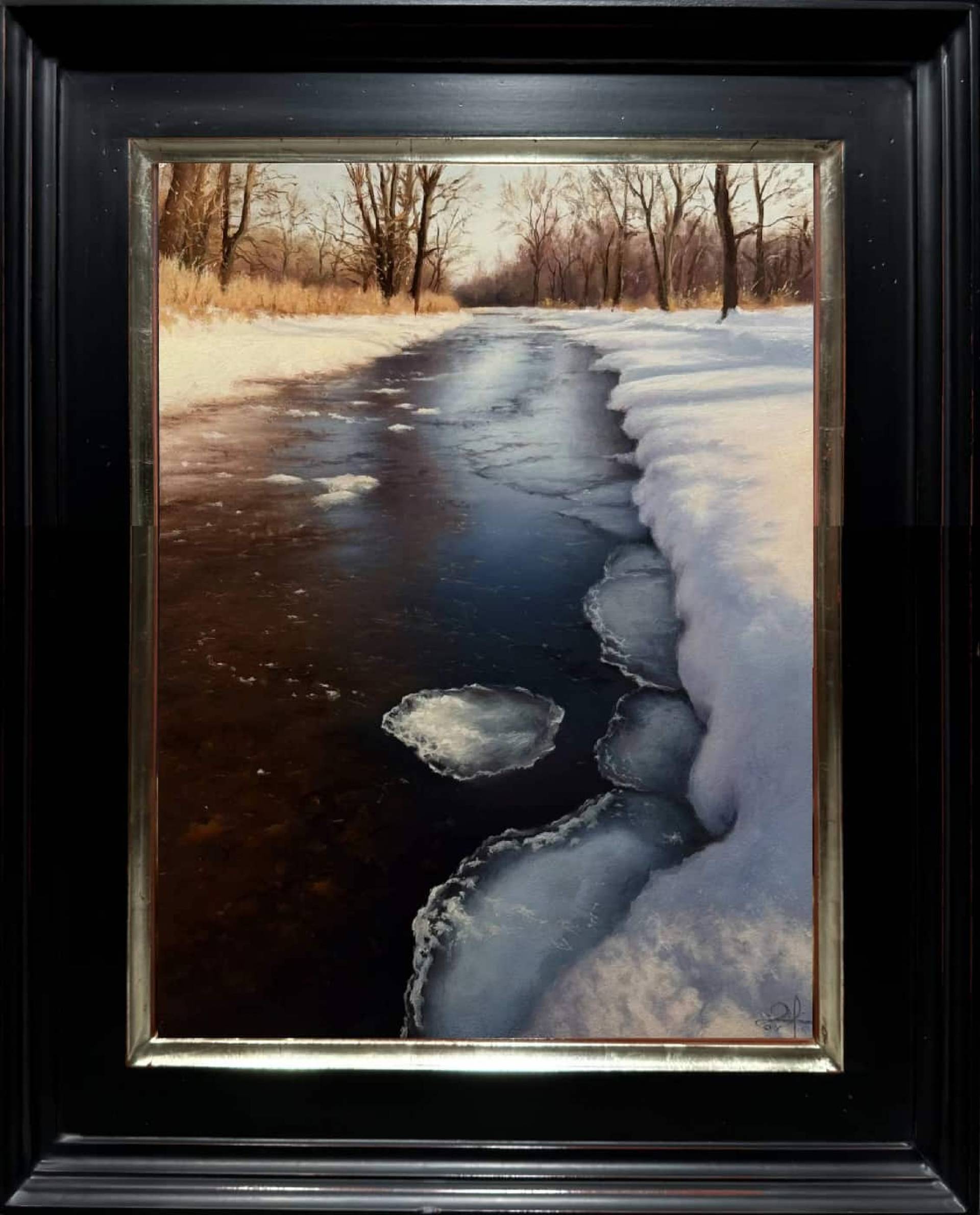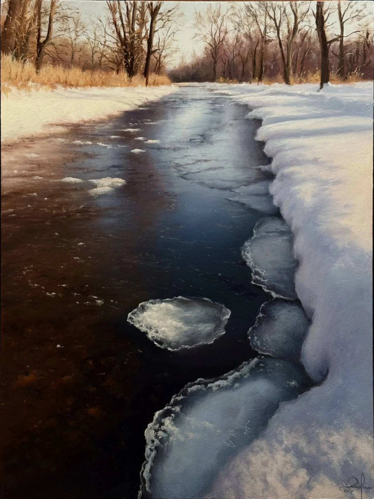 Na obrazie Piotra Grzechowskiego zimowa rzeka płynie cicho, lecz nieustępliwie, rozcinając śnieżną ciszę niczym ciemna myśl w białym śnie. Tafla wody odbija chłodne niebo i nagie drzewa, a unoszące się kry lodowe przypominają fragmenty czasu – kruche, chwilowe, skazane na powolne znikanie. Brzegi rzeki, oblepione śniegiem, trwają w bezruchu, podczas gdy nurt niesie ze sobą zapowiedź odwilży i zmiany. To pejzaż skupiony i kontemplacyjny, w którym natura mówi szeptem o przemijaniu, cierpliwości i nieuchronnym ruchu życia.