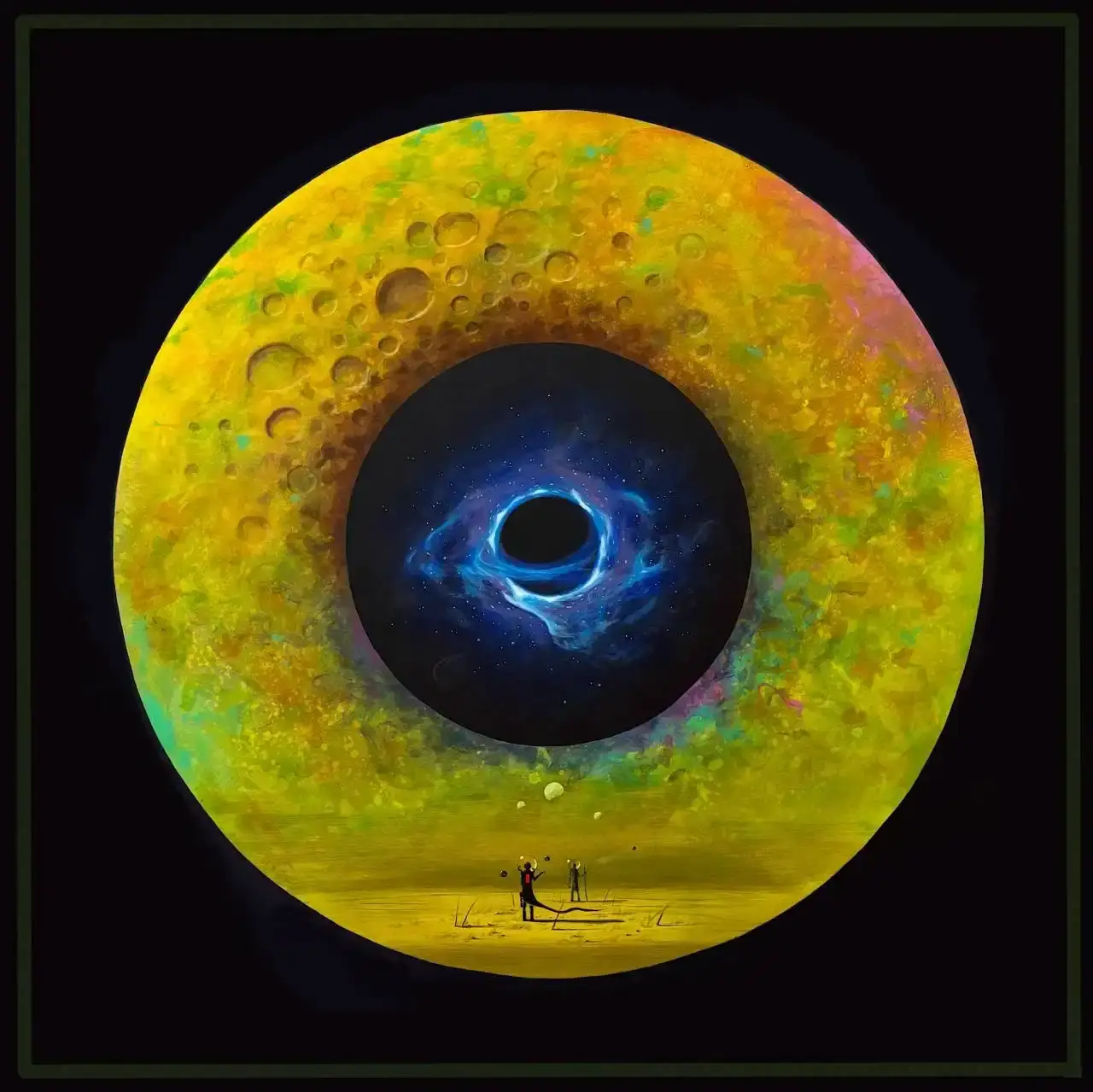Czerń w tym obrazie nie jest pustką. Zawerniksowana matowym satynowym wykończeniem, staje się jak aksamitne tło, które pochłania światło i prowadzi wzrok ku centrum. Tam, gdzie zaczyna się kolor — intensywny, świetlisty, zalany błyszczącym werniksem — tam właśnie zaczyna się pytanie. Czy patrzysz na koniec, czy początek? Na ślad po istnieniu, czy jego źródło?