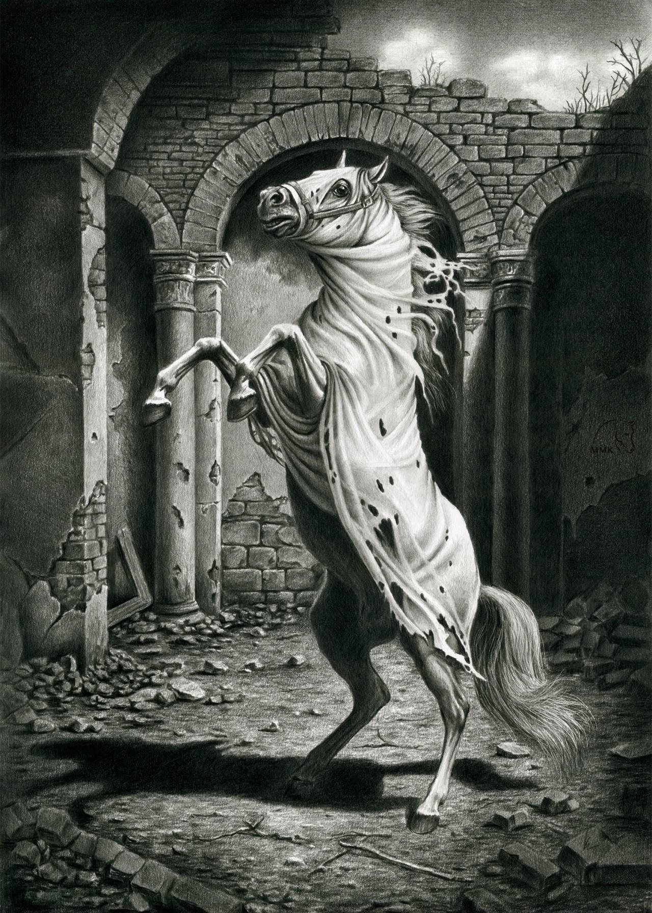 Otoczenie zniszczonych murów, pękniętych łuków i osypujących się cegieł buduje przestrzeń po katastrofie. Architektura, niegdyś trwała, staje się krucha i bezbronna, a cisza ruin zdaje się gęstnieć wokół jedynej żywej istoty. Koń, opleciony fragmentami materii przypominającej rozdartą tkaninę lub ślady rozpadu, nabiera symbolicznego znaczenia – jest nośnikiem pamięci, ostatnim świadkiem zdarzeń, których nie da się już odtworzyć.