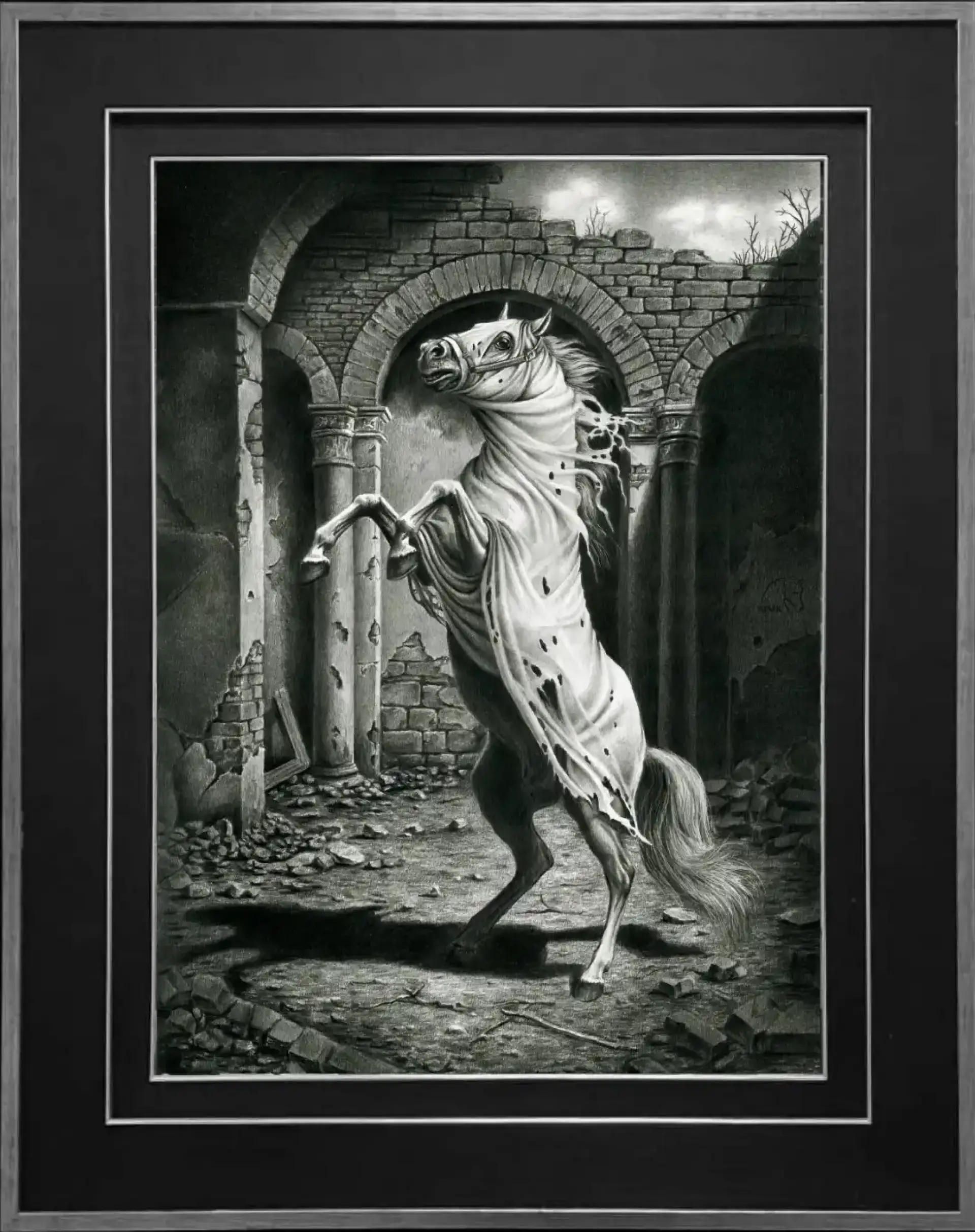 Precyzja rysunku i operowanie światłocieniem nadają pracy niemal rzeźbiarską formę. Każdy detal – od napięcia mięśni zwierzęcia po fakturę zniszczonego muru – podkreśla atmosferę niepokoju i zawieszenia. To obraz o przemijaniu, o kruchości struktur i o tym, co pozostaje, gdy wszystko inne znika.