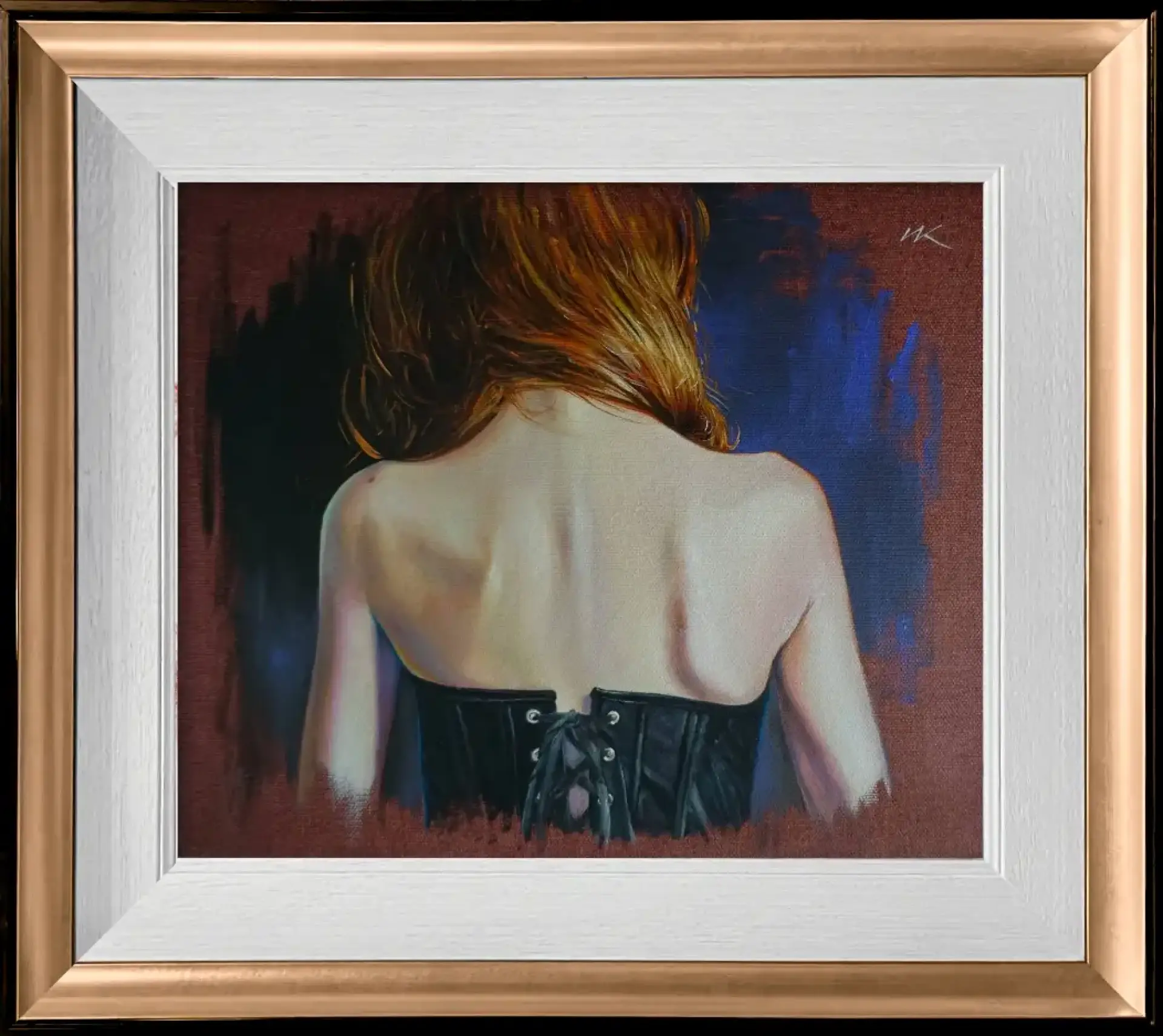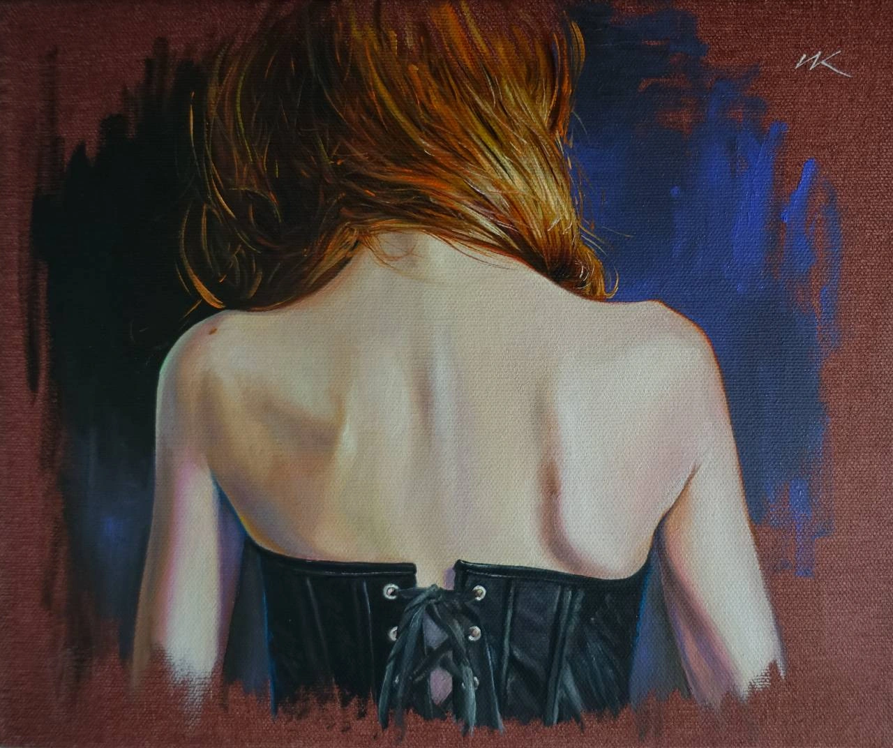 Plecy Matyldy są jak mapa emocji — napięte, odsłonięte, prawdziwe. Ciepłe światło osiada na skórze, wydobywając delikatność i siłę jednocześnie, podczas gdy ciemny gorset trzyma w ryzach to, co niewypowiedziane. Włosy spływają jak myśl urwana w pół zdania, a tło pulsuje ciszą powrotu — do siebie, do wspomnienia, do momentu, który nie potrzebuje twarzy. To obraz intymny, skupiony, pełen zawieszonego oddechu.