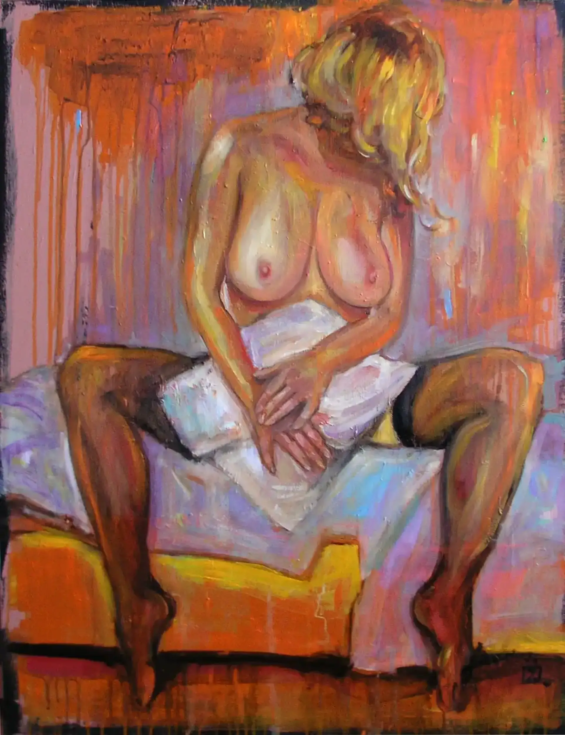 Obraz przedstawia siedzącą kobietę uchwyconą w intymnej, lecz nie wulgarnej chwili. Jej ciało jest pełne miękkiego światła i ciepłych tonów – od różów po pomarańcze i brązy, które tworzą atmosferę intensywnego ciepła i emocji. Postać zakrywa się białą tkaniną, jakby balansowała między odsłonięciem a pragnieniem prywatności. Jej głowa jest pochylona, włosy opadają swobodnie, a ciało emanuje pulsującą energią, zmysłowością i bezbronnością. To obraz o pragnieniu, wstydzie i sile kobiecej cielesności.