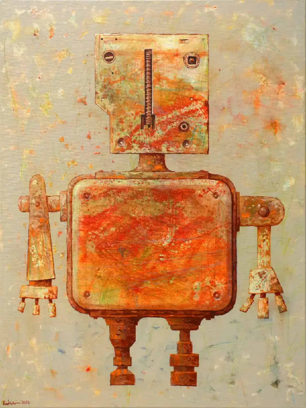 Na płótnie stoi postać, która zdaje się być bardziej wspomnieniem maszyny niż samą maszyną — rdzawy, geometryczny humanoid o prostych, niemal dziecięcych proporcjach. Jego ciało zbudowane jest z metalowych płyt i śrub, jakby ktoś poskładał je z fragmentów zapomnianych urządzeń. Głowa — kwadratowa, z pojedynczym pionowym elementem przypominającym śrubę lub suwak — nadaje mu wyraz zdziwionego milczenia. Ramiona zakończone są wtyczkami, jakby szukał połączenia, którego świat już mu nie oferuje. Tło, jasne i rozedrgane, pełne plam i smug, kontrastuje z ciężarem postaci — jakby czas próbował go rozpuścić w pamięci. To portret samotności technologii, która przeżyła swoich twórców.