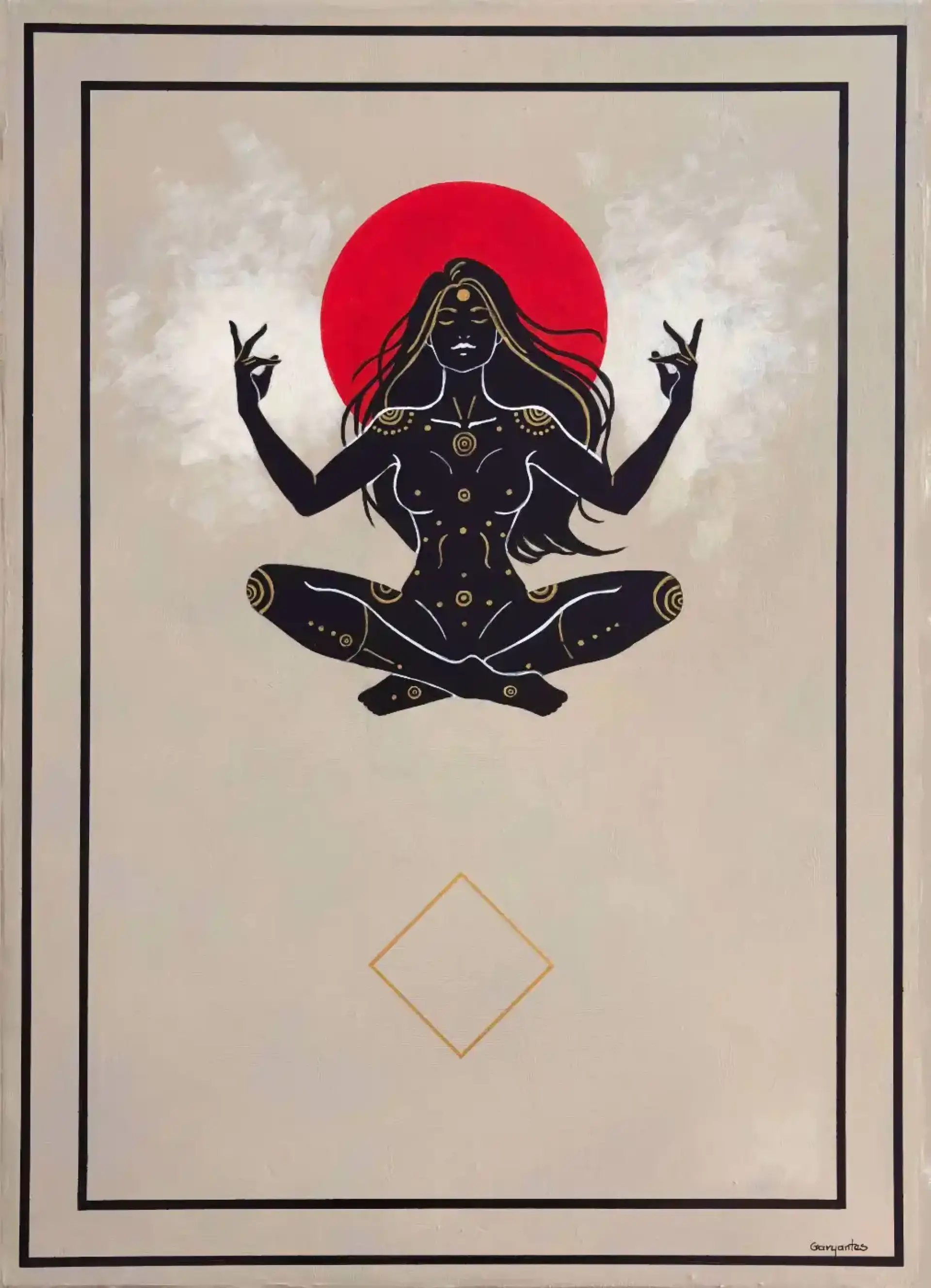 „Równowaga złotej świadomości” to obraz, który nie potrzebuje słów — wystarczy spojrzenie, by poczuć jego puls. Dla tych, którzy czują zanim zobaczą, staje się punktem skupienia i ozdobą przestrzeni, w której cisza ma znaczenie. Czerwone słońce i złote światło tworzą mistyczny balans pomiędzy widzialnym a ukrytym, jak oddech pomiędzy światami.