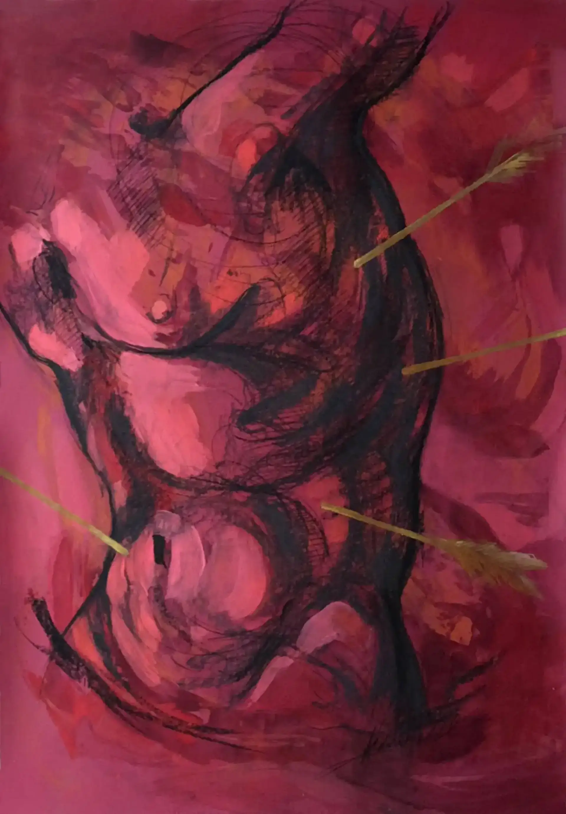 Postać wyłania się z purpury jak napięcie spod skóry — niejednoznaczna, poruszona, na granicy bólu i ekstazy. Czerwień pulsuje tu jak żywe ciało, a czarne, nerwowe linie rysują sylwetkę raczej odczuwaną niż widzianą. Złote, ostre akcenty przecinają kompozycję niczym strzały: są raną, znakiem, ale też światłem. To nie jest scena męczeństwa w dosłownym sensie — to współczesny San Sebastiano, zapis wewnętrznego napięcia, kruchości i siły jednocześnie. Obraz mówi o ciele jako miejscu pamięci, emocji i trwania.