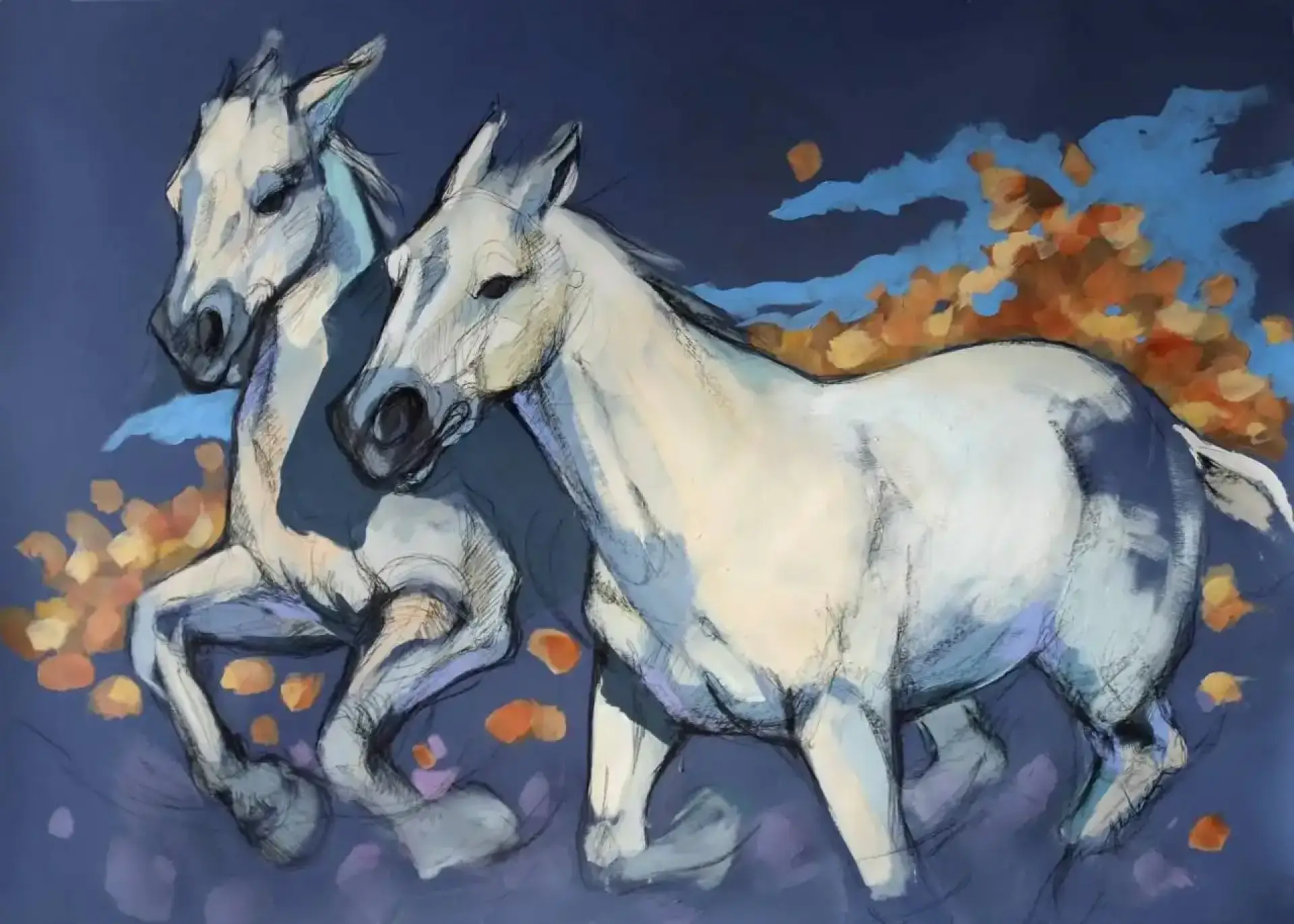 Dwa siwe konie wyłaniają się z granatowego tła jak wspomnienie ruchu — lekkie, niemal szkicowe, a jednak pełne energii. Ich ciała są napięte w półgalopie, jakby czas na moment zwolnił, pozwalając uchwycić rytm oddechu i mięśni. Ciepłe, jesienne plamy barw unoszą się wokół nich niczym liście porwane wiatrem. To obraz o wolności i przemijaniu — o biegu ku jesieni, który nie jest ucieczką, lecz świadomym trwaniem w ruchu.