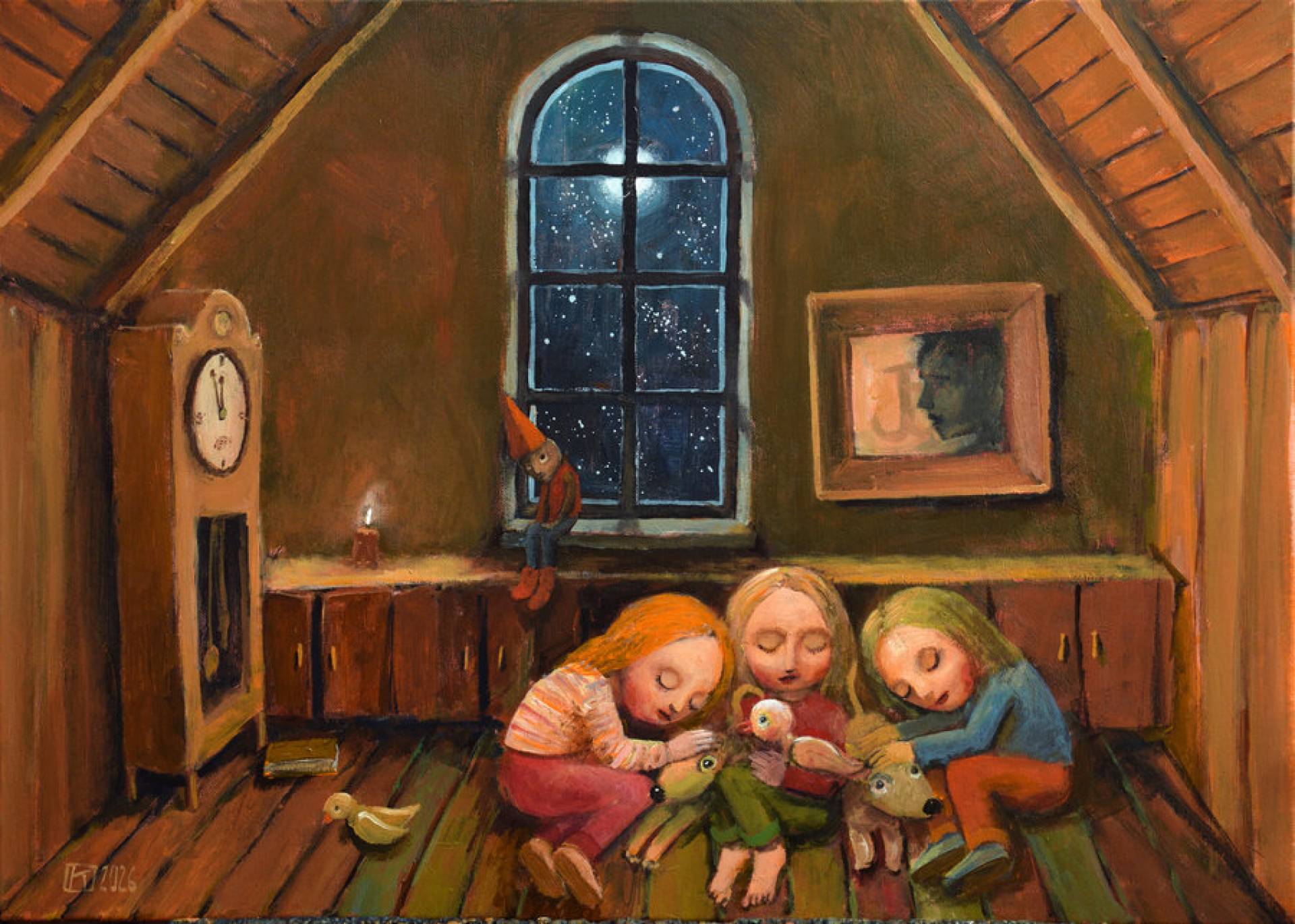„Śpiące dzieci” to nastrojowa, ilustracyjno-baśniowa scena rozgrywająca się w przestrzeni poddasza, gdzie czas zdaje się płynąć inaczej. Trójka dzieci zasypia w ciepłym kręgu wzajemnej bliskości, wtulona w zabawki, podczas gdy za oknem rozciąga się nocne niebo pełne gwiazd. Obecność zegara i małej świecy wprowadza motyw upływu czasu oraz kruchego światła czuwania. Iwin buduje atmosferę ciszy i bezpieczeństwa, lecz podszywa ją subtelną melancholią. Drewniane wnętrze, pochylone ściany i zamknięta przestrzeń poddasza tworzą intymny świat dziecięcej wyobraźni — zawieszony między snem a jawą. Ciepła kolorystyka kontrastuje z chłodem nocy za oknem, podkreślając granicę między światem realnym a sferą marzeń. Obraz jest refleksją nad dzieciństwem jako czasem niewinności, wspólnoty i cichej tajemnicy.