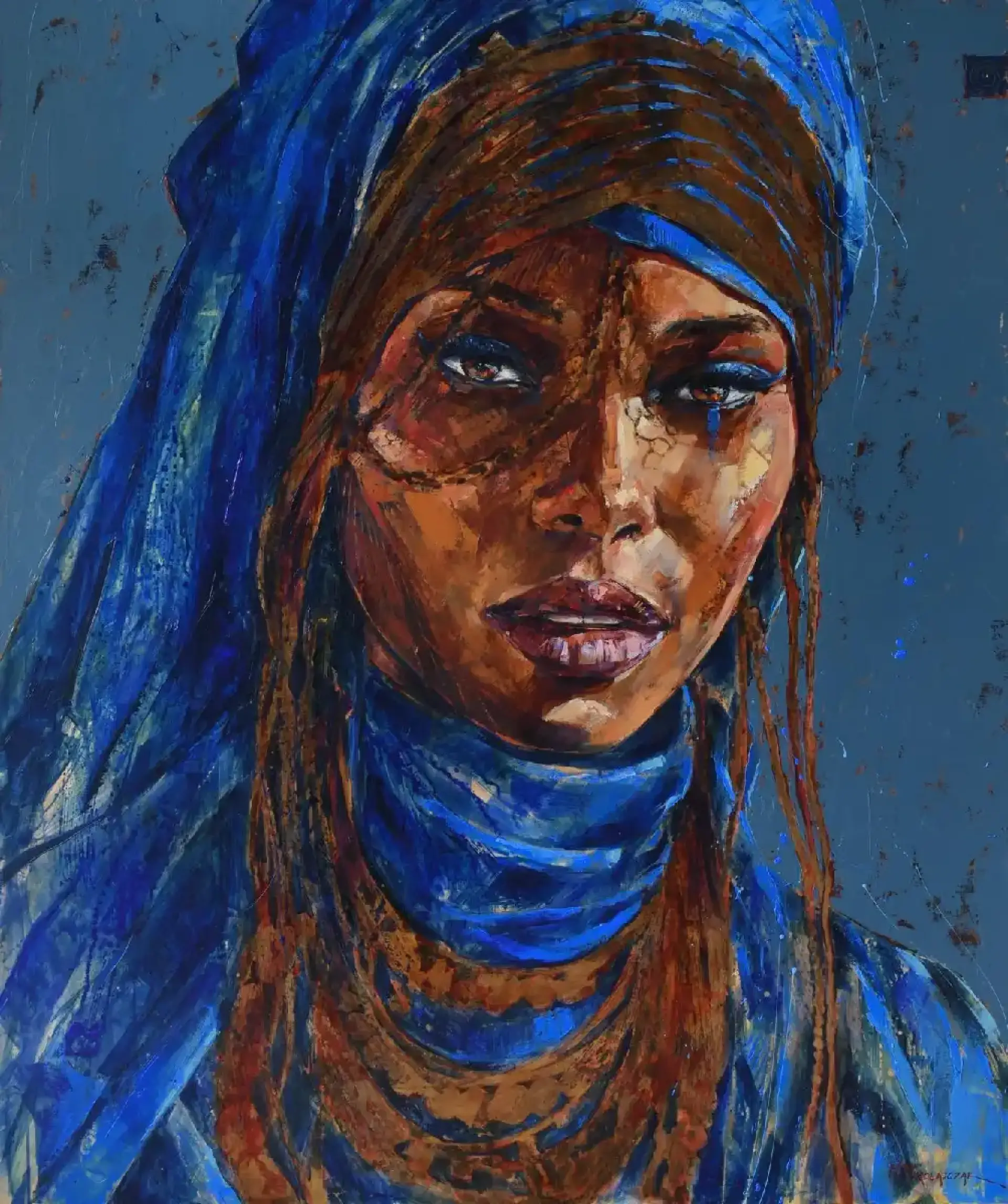 Twarz kobiety wyłania się z intensywnego błękitu jak z ciszy przed burzą. Głębokie, przenikliwe spojrzenie niesie w sobie jednocześnie siłę i kruchość — jakby przeszło przez ogień i piasek, a mimo to zachowało światło. Turkusowy zawój oplata głowę i szyję, stapiając się z chłodnym tłem, podczas gdy ciepłe brązy i rdzawe tony skóry pulsują energią ziemi.