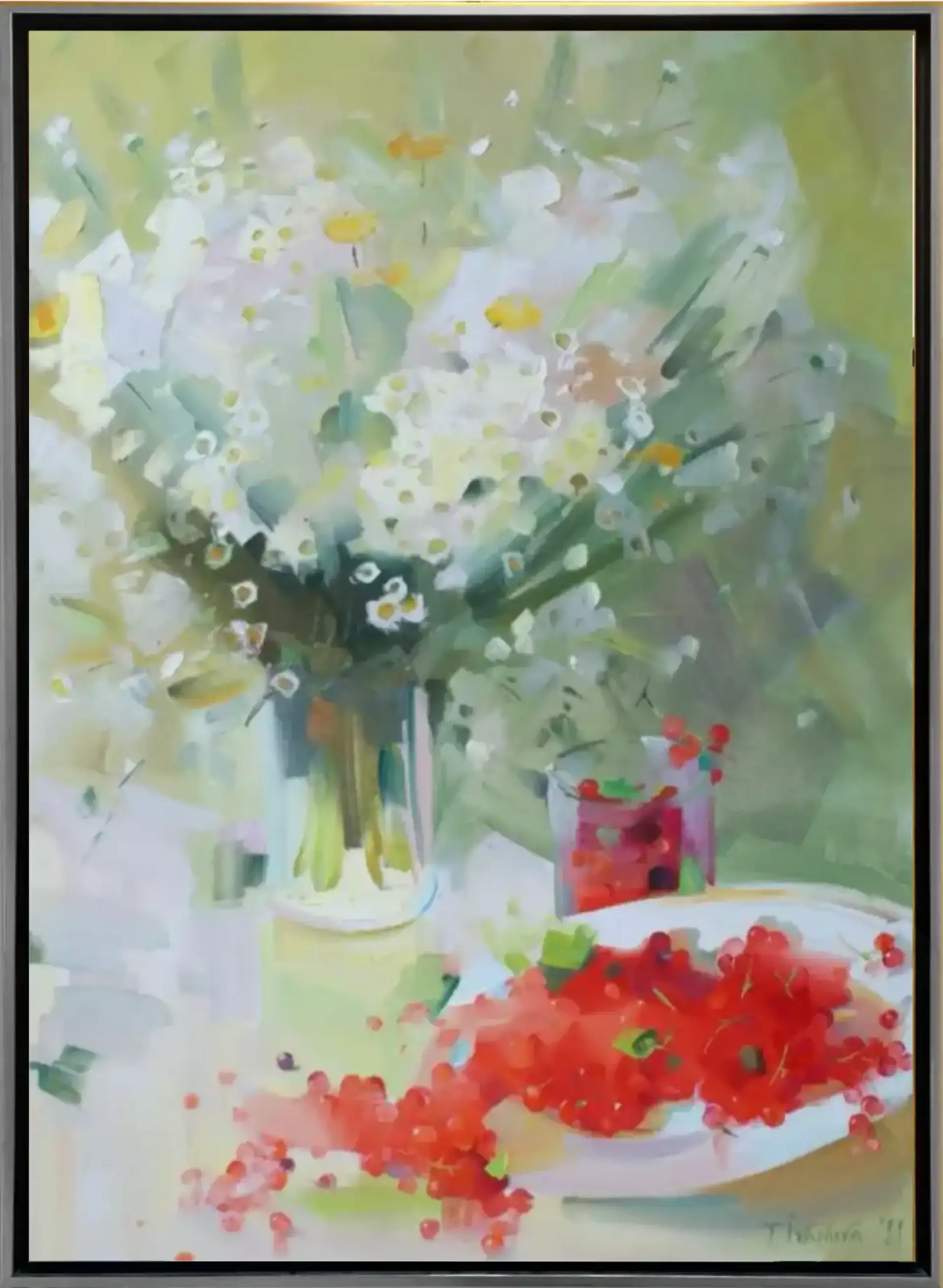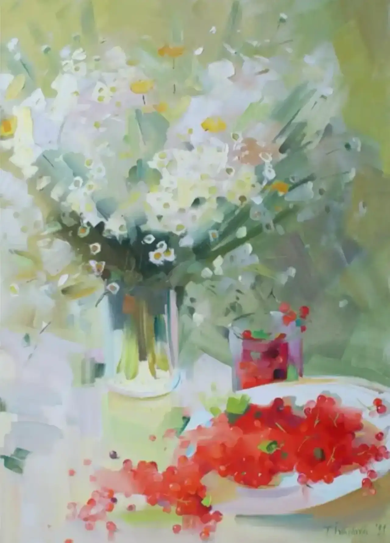 Na jasnym stole lato rozlało się miękkim światłem. Białe kwiaty, malowane szybkim, swobodnym gestem, unoszą się jak obłoki nad zielenią tła. Obok nich — czerwone porzeczki, soczyste i świeże, rozsypane niczym drobne rubiny, które właśnie wypadły z dłoni. Obraz oddycha spokojem letniego poranka: chwilą bez pośpiechu, zapachem ogrodu i cichą radością prostych rzeczy. To opowieść o smaku lata, zatrzymanego na moment przed zniknięciem.