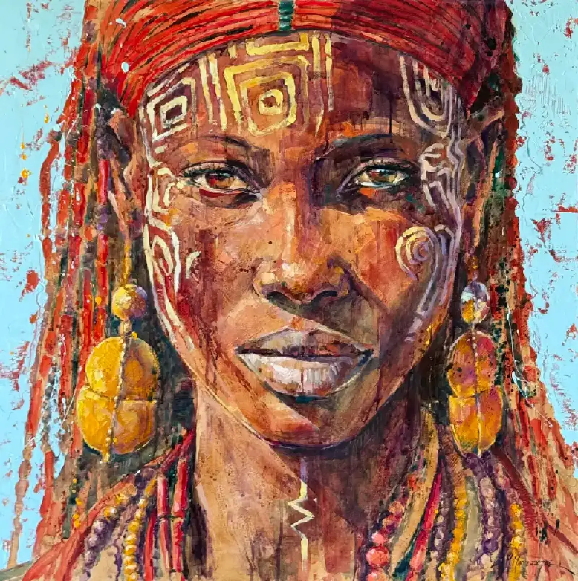 Na obrazie Marcina Mikołajczaka „Światło pustyni” twarz kobiety jaśnieje niczym święty znak zapisany w piasku i słońcu. Jej spojrzenie jest głębokie jak cisza o świcie nad wydmami – pełne dumy, pamięci i nieskończonej siły przodków. Złoto i ochra grają z błękitem tła, jakby ciepło pustyni spotykało chłód nieba.