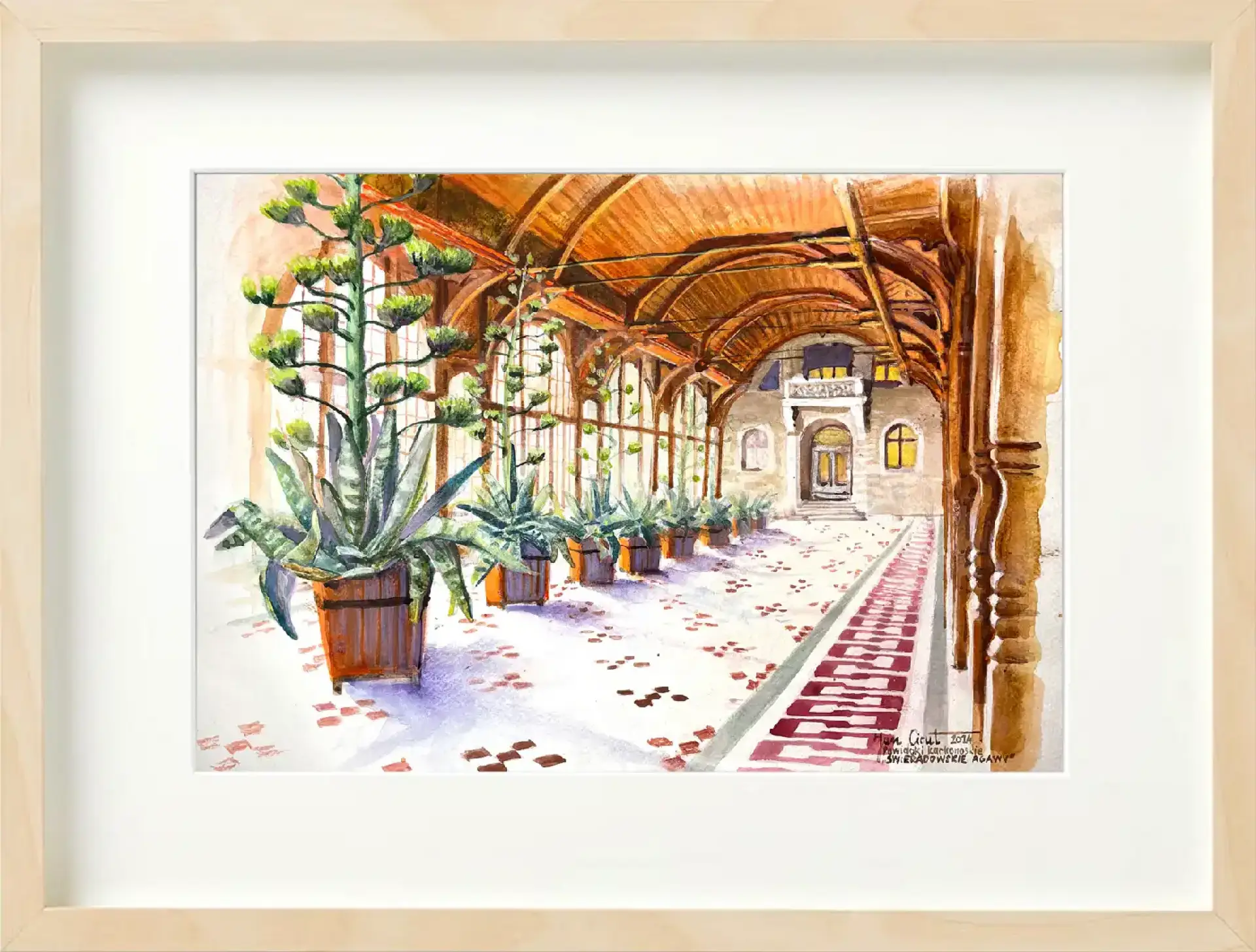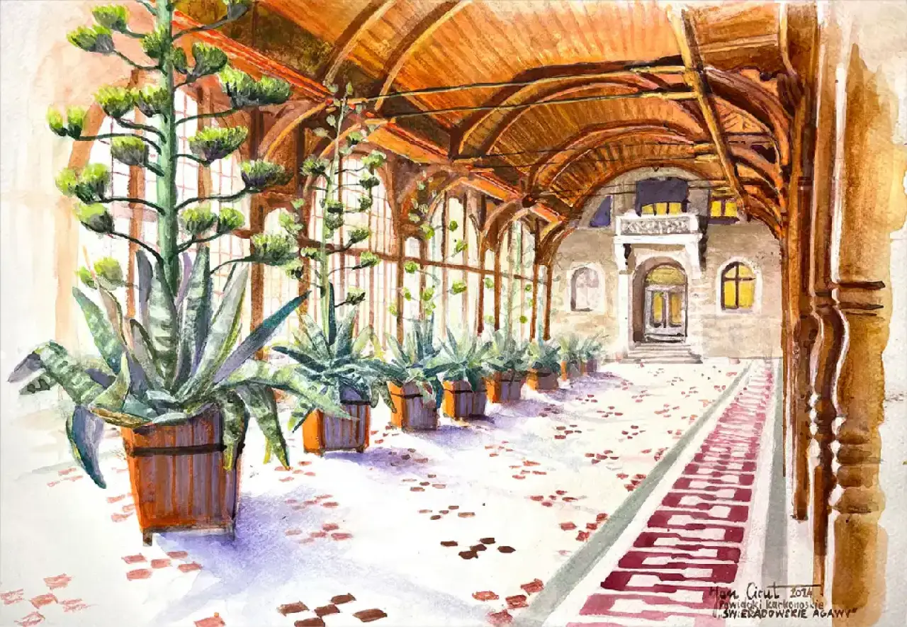 Akwarela przedstawia elegancką, przeszkloną galerię spacerową w Świeradowie-Zdroju. Drewniana, łukowa konstrukcja dachu prowadzi wzrok w głąb kompozycji, aż do jasnego wejścia budynku zamykającego perspektywę. Wzdłuż alei ustawiono rząd donic z monumentalnymi agawami i smukłymi roślinami, których chłodna zieleń kontrastuje z ciepłymi tonami drewna i złamanej bieli ścian. Na posadzce rozsypane są drobne liście, a światło miękko filtruje się przez szklane tafle, budując atmosferę spokoju i uzdrowiskowej ciszy. To obraz harmonii architektury i natury – miejsce zatrzymania, oddechu i kontemplacji.
