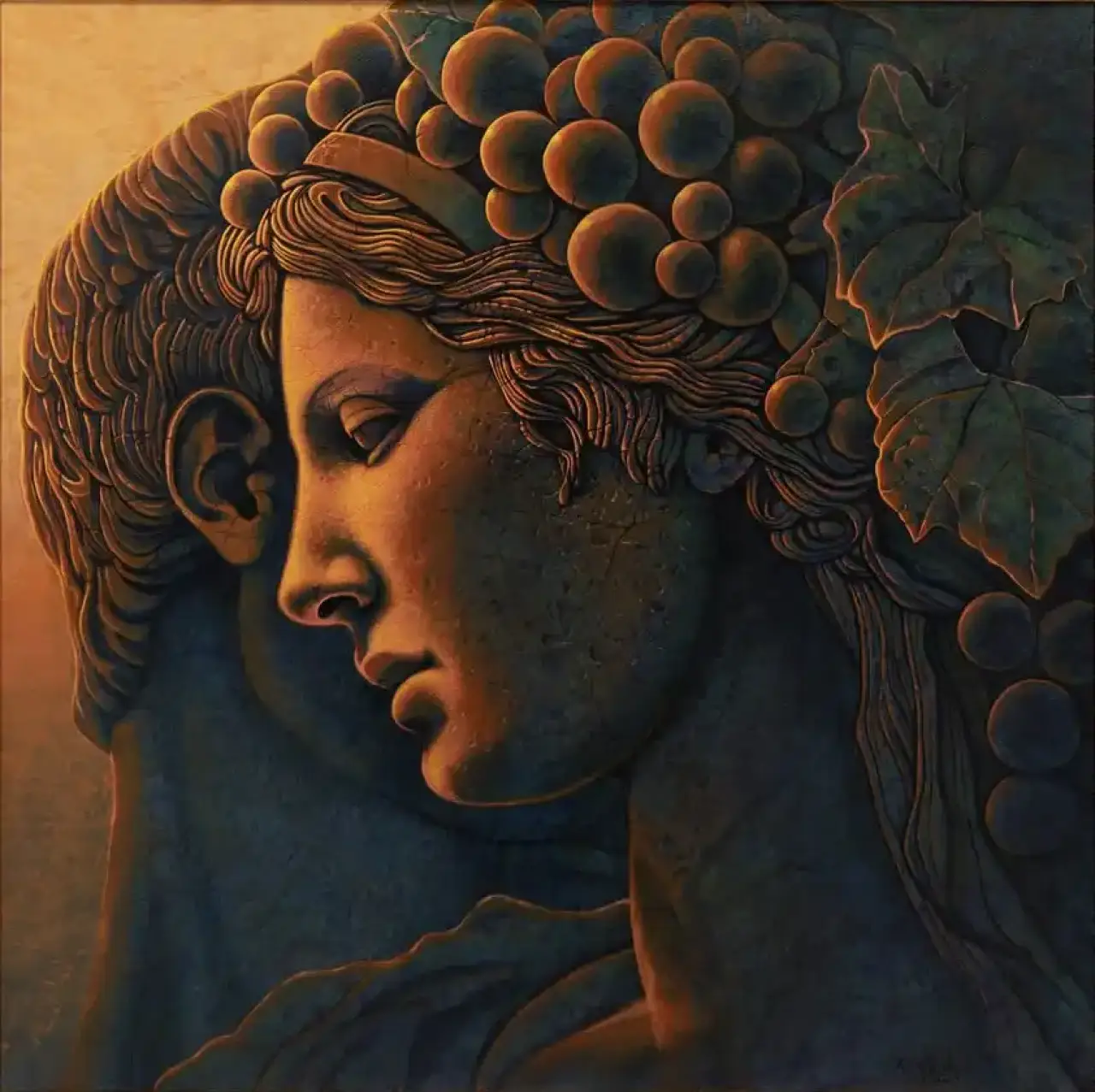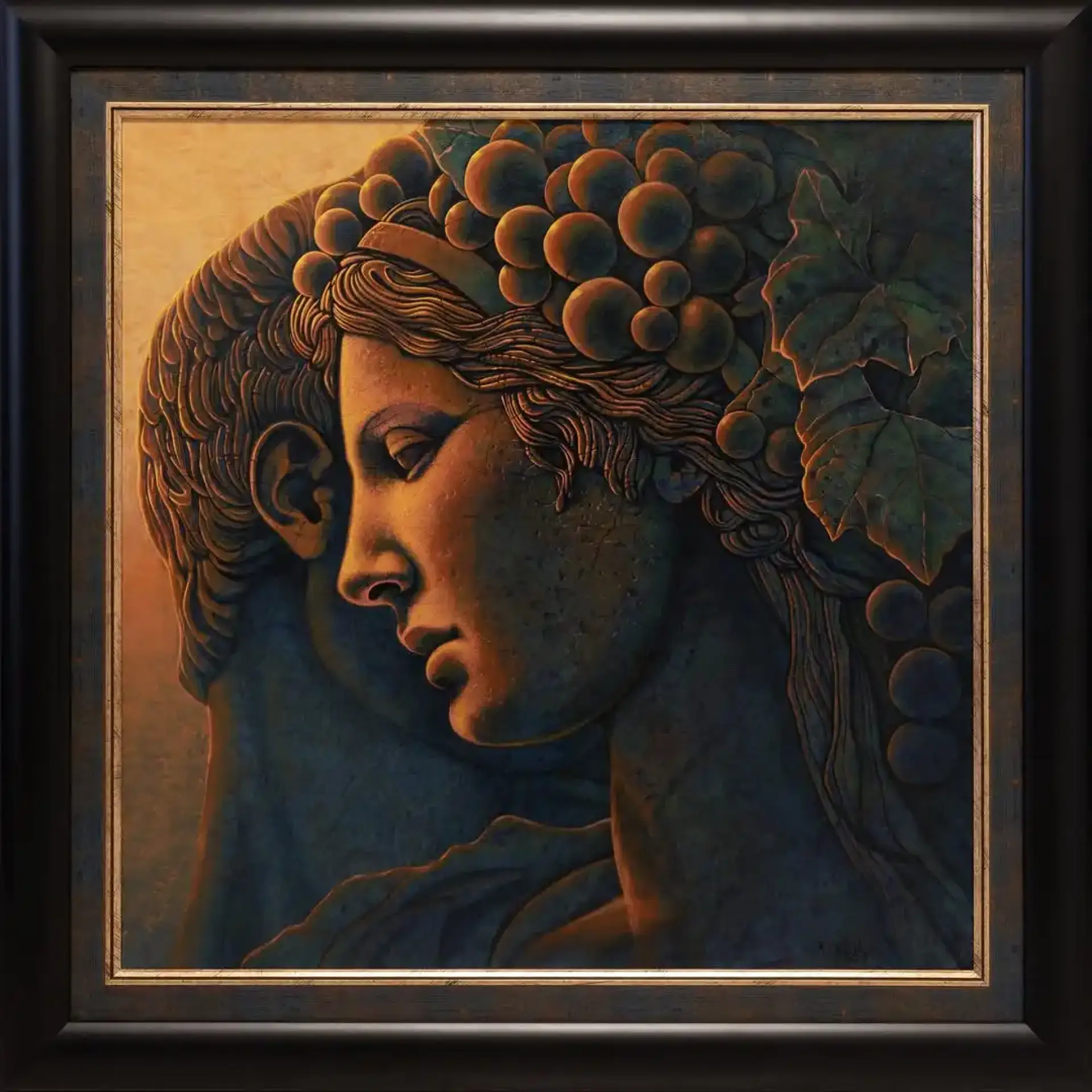 Z mroku ciepłych brązów i oliwkowych zieleni wyłania się twarz – klasyczna w rysunku, niemal rzeźbiarska w formie, a jednak zanurzona w ciszy snu. Głowa, lekko pochylona, nosi w sobie ciężar antycznego spokoju i intymnego skupienia. Winogrona i liście, jak korona z pamięci natury, oplatają włosy, przywołując skojarzenia z bachicznym rytuałem, ale bez krzyku – raczej w szeptach, ledwo słyszalnych. Faktura malarska nadaje twarzy wrażenie kamienia ożywionego światłem, jakby czas na moment zapomniał płynąć. To obraz kontemplacji, gdzie mit spotyka melancholię, a cisza staje się głównym bohaterem.