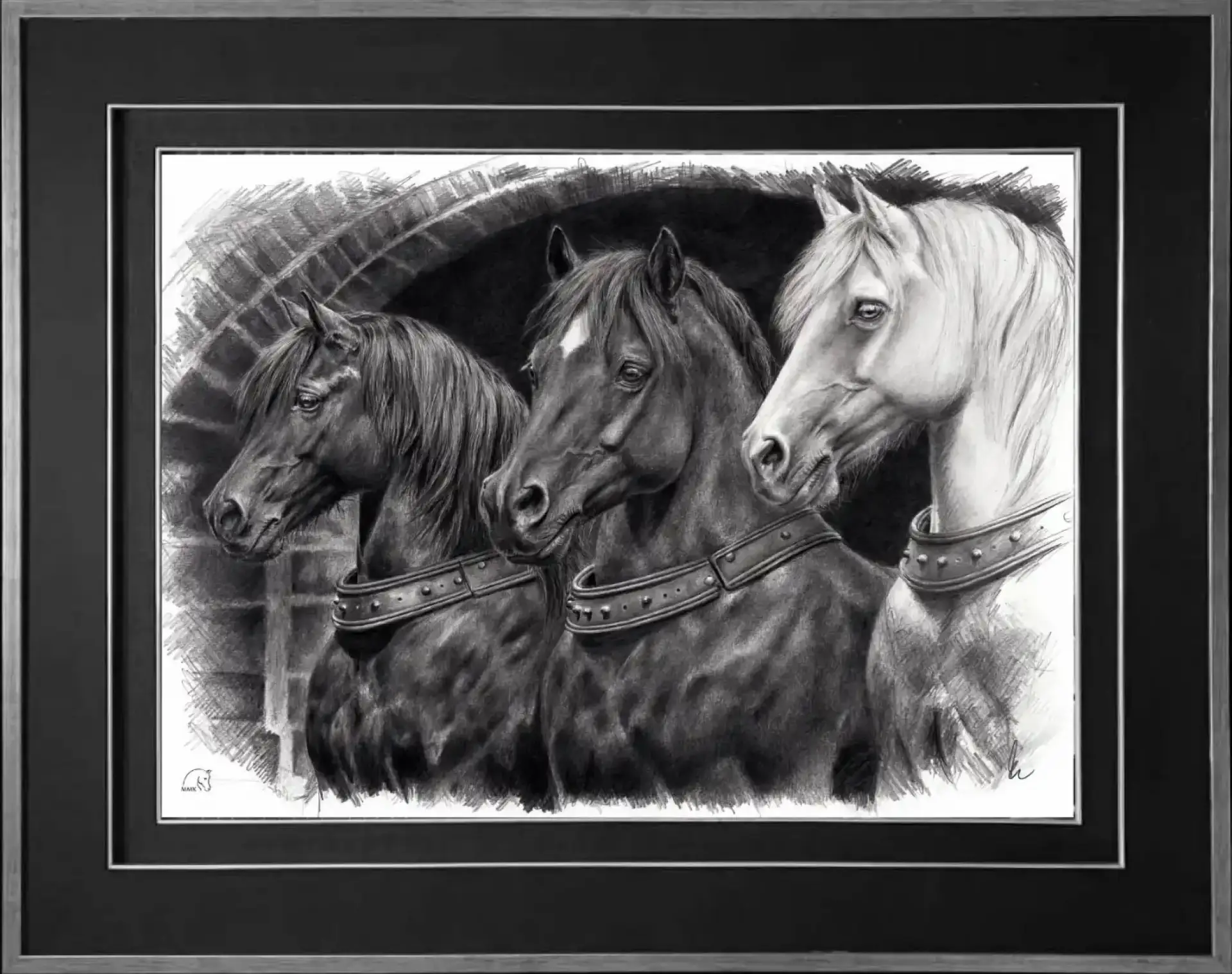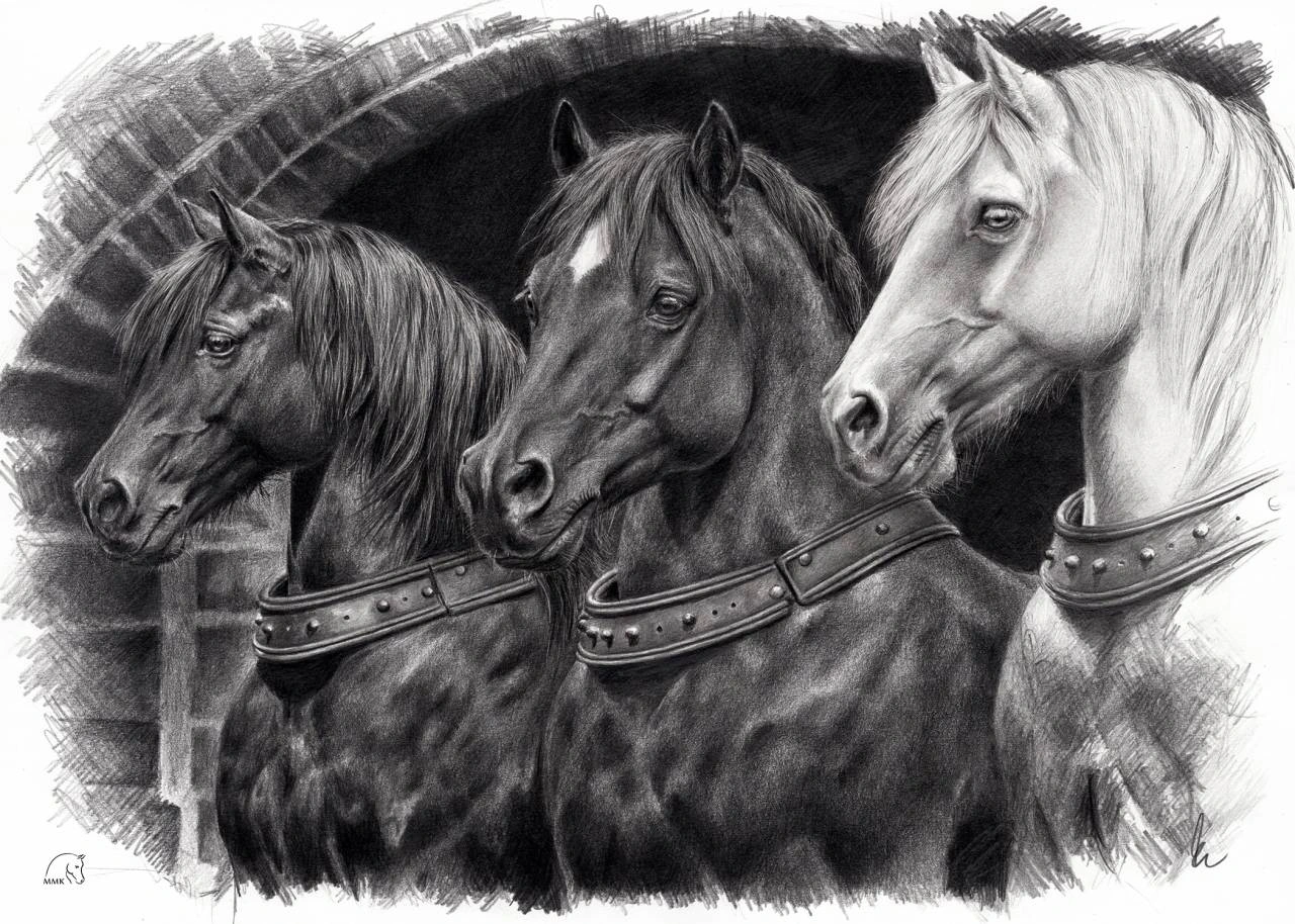 „Trójka w Rzymie” autorstwa Magdalena Muraszko-Kowalska to mistrzowski rysunek, w którym siła, elegancja i dyscyplina spotykają się w jednej, harmonijnej kompozycji. Trzy konie ukazane w półprofilu tworzą zwartą, niemal rzeźbiarską formę, podkreśloną głębokim światłocieniem i dynamiczną kreską.