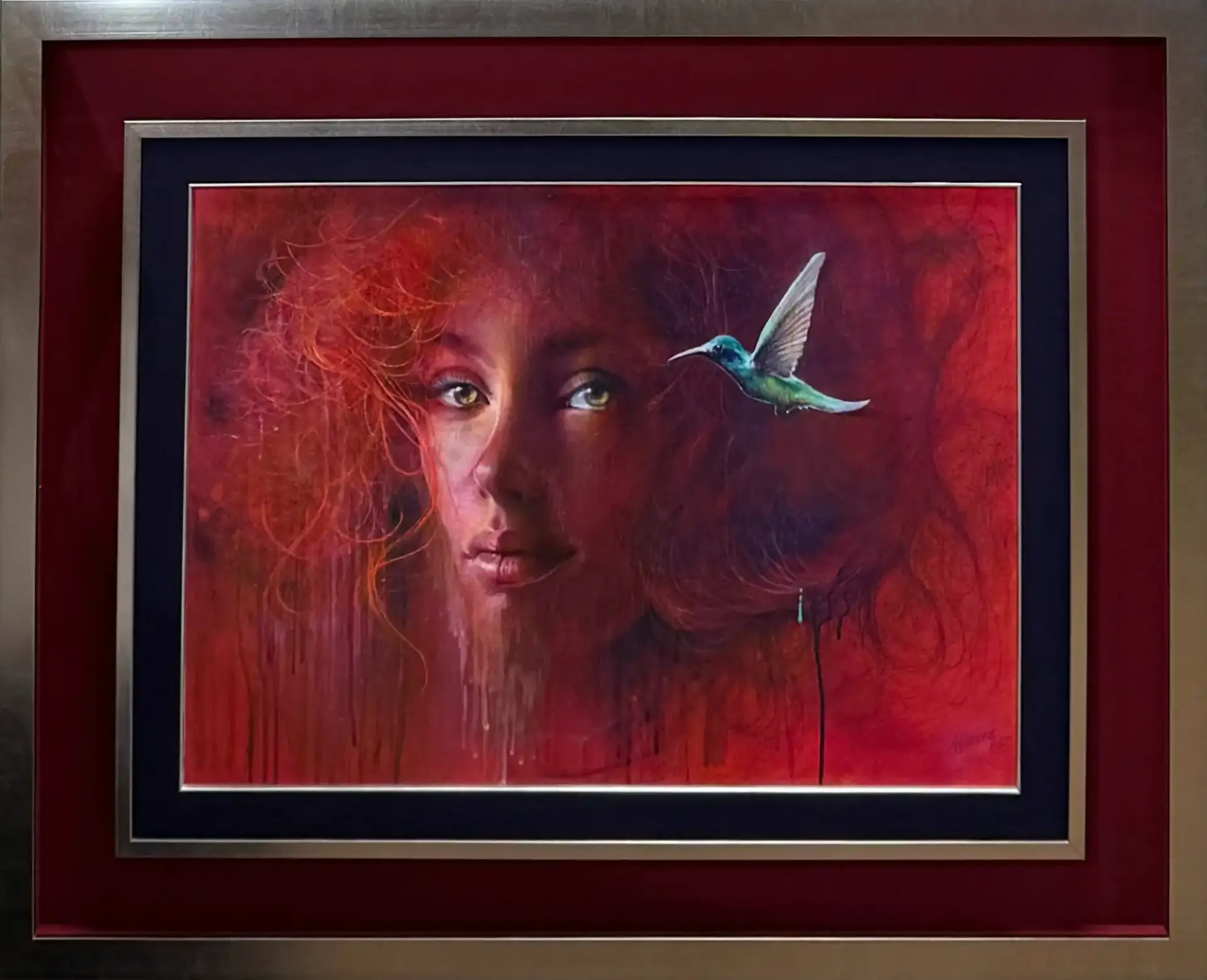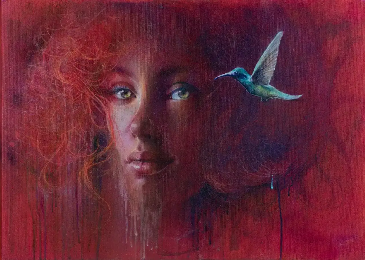 Na intensywnie czerwonym tle wyłania się twarz kobiety o rozwianych, miedzianych włosach i hipnotyzującym spojrzeniu. Obok niej zawisa w powietrzu turkusowy koliber — lekki, niemal eteryczny akcent chłodnej barwy pośród ciepłych tonów. Jednak uwagę przyciąga drobny, przewrotny detal: maleńka turkusowa kropla „co nieco”, którą ptak właśnie wypuścił w locie. Ten subtelny, ironiczny gest przełamuje powagę kompozycji i wprowadza nutę humoru, kontrastując z lirycznym, niemal mistycznym nastrojem portretu. Delikatne zacieki farby spływające w dół potęgują wrażenie płynności emocji i chwili zatrzymanej między powagą a przekornym mrugnięciem oka.