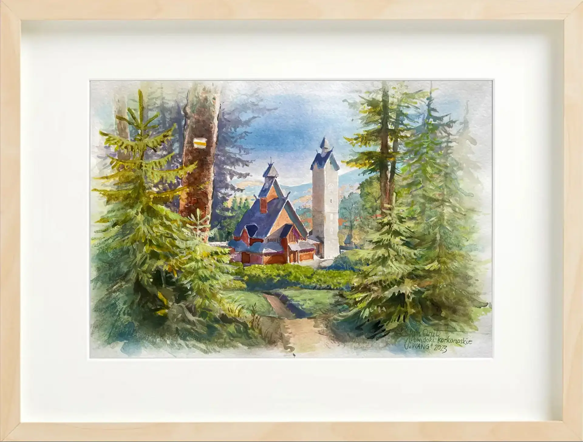 Świątynia Wang wyłania się z karkonoskiego lasu jak opowieść zapisana w drewnie i ciszy. Akwarela Jana Ciruta prowadzi wzrok wąską ścieżką między świerkami, ku miejscu, gdzie architektura i natura od wieków trwają w harmonii. Ciepłe brązy kościoła kontrastują z chłodną zielenią drzew i błękitem nieba, tworząc obraz spokoju i zakorzenienia. To nie tylko widok – to chwila skupienia, spotkanie sacrum z krajobrazem, w którym czas zwalnia, a Karkonosze odsłaniają swoją łagodniejszą twarz.