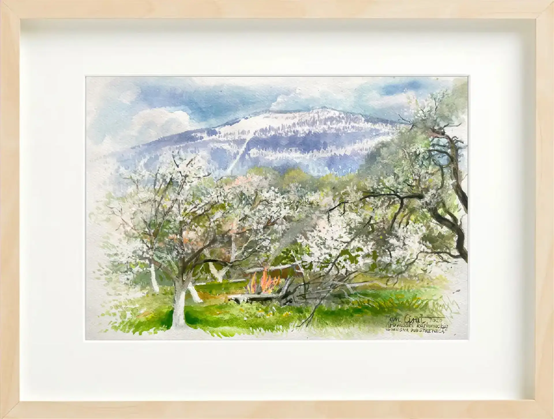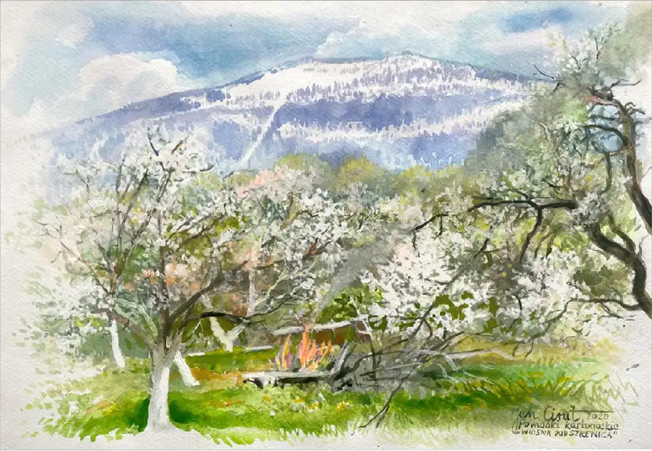 Wiosna pod Szrenicą budzi się cicho, niemal szeptem. Kwitnące drzewa rozlewają się bielą i pastelami, jakby góra oddychała świeżym światłem po długiej zimie. Akwarela Jana Ciruta łączy delikatność pierwszych liści z monumentalnym spokojem Karkonoszy w tle. To obraz przejścia – momentu, gdy natura odzyskuje rytm, a krajobraz staje się obietnicą nowego początku, pełnego lekkości i nadziei.