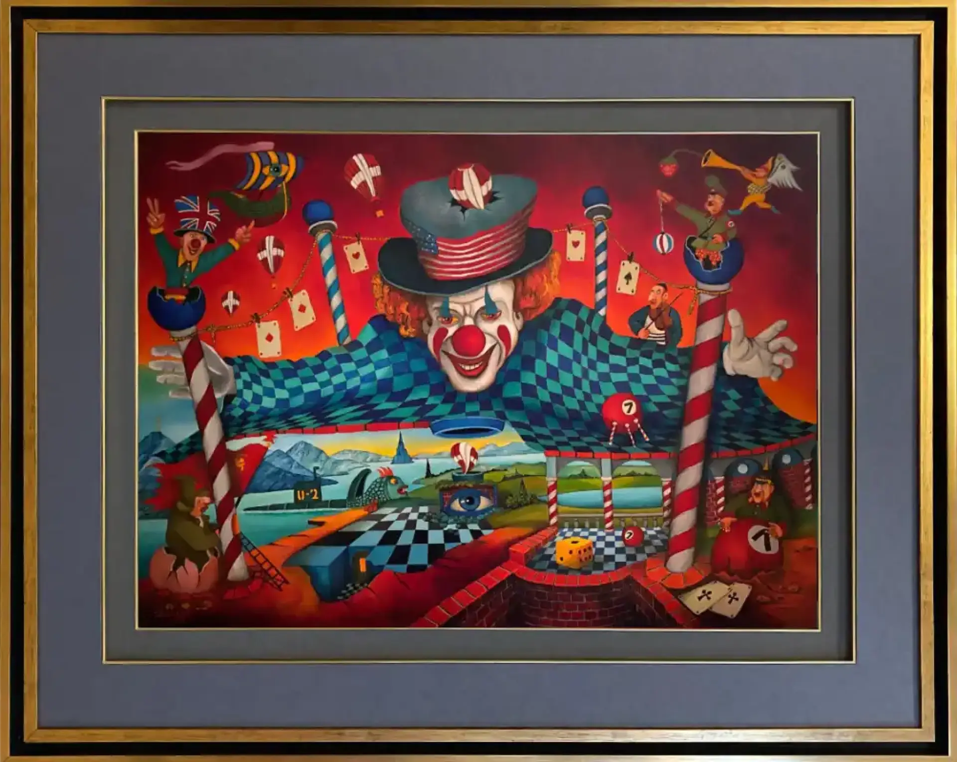 Karty, kości, kule bilardowe i numery mówią o losie zaprogramowanym z góry, o przypadku, który tylko udaje wolność. Balony i akrobaci unoszą się lekko nad sceną, jak medialne obietnice — kolorowe, atrakcyjne, krótkotrwałe. Oko w pejzażu patrzy uważnie: to świadomość, nadzór, może sumienie, które widzi więcej niż chcieliby gracze.