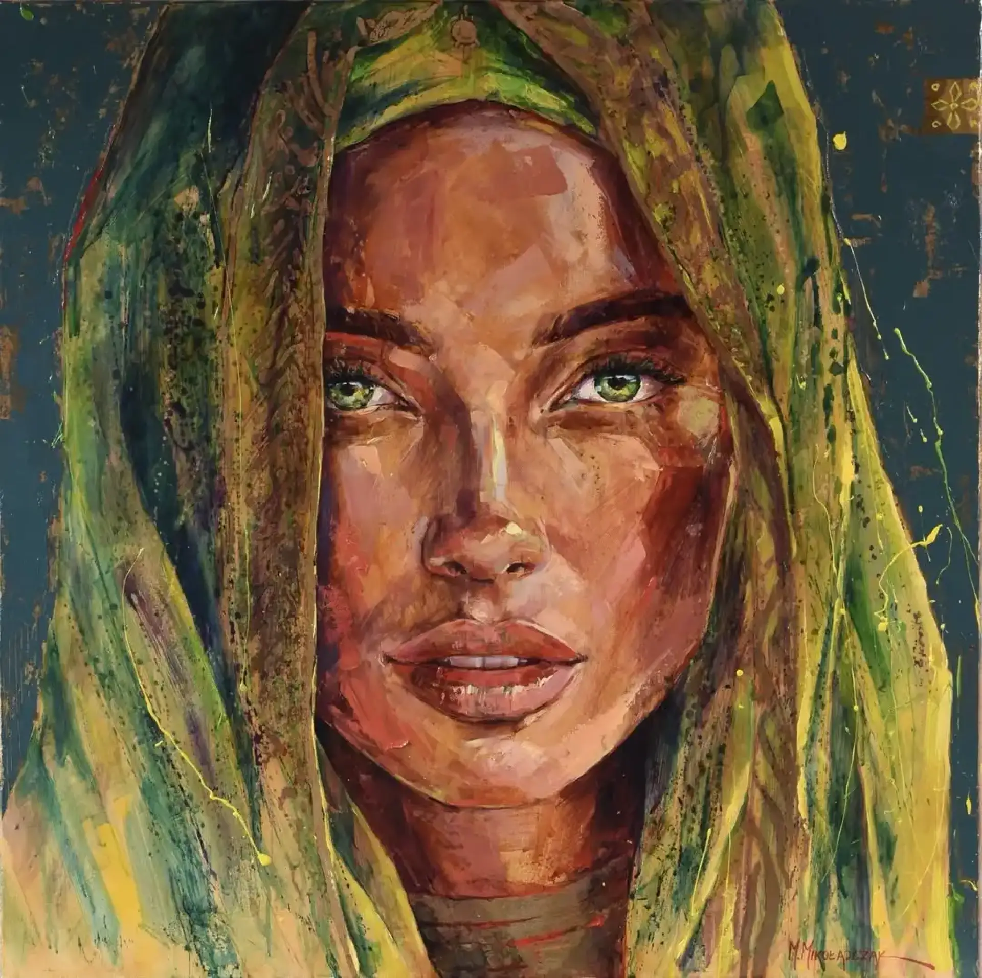 „Zapach wiosny” autorstwa Marcin Mikołajczak to ekspresyjny portret, w którym malarska materia i kolor budują atmosferę świeżości i odrodzenia. Twarz młodej kobiety wyłania się z miękkich, zielonych fałd tkaniny otulającej głowę niczym lekki wiosenny welon.